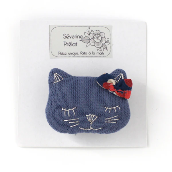 Broche en tissu Chat – Bleu foncé et Fleurs – Séverine Prélat