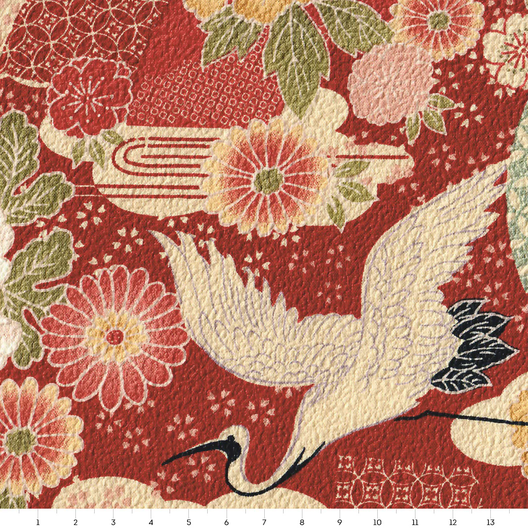 Tissu Japonais – Grues, Fleurs et Ellipses – Rouge Brique, Beige, Vert et Bleu Ciel – T474