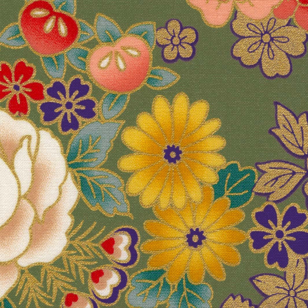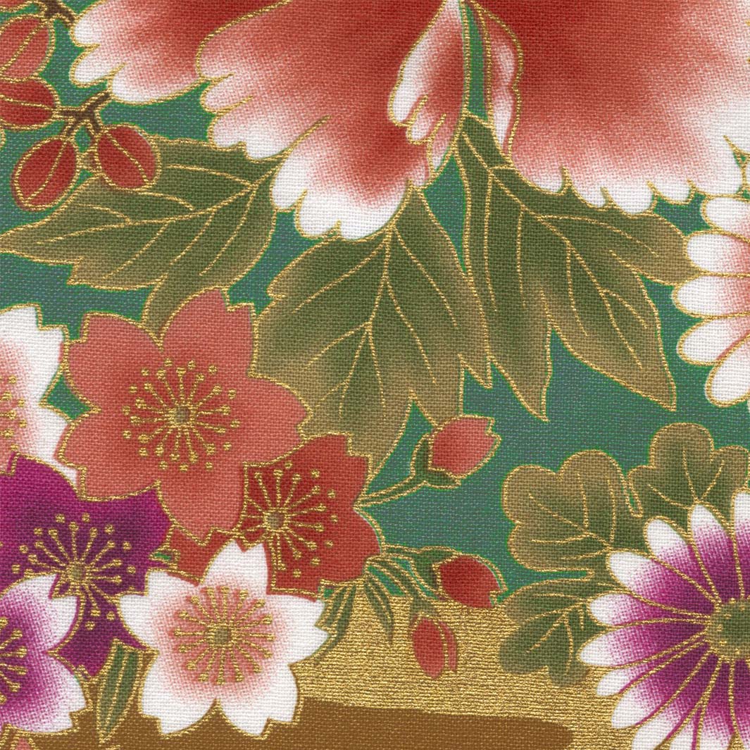 Tissu Japonais – Fleurs et Dorures – Vert, Or, Rouge et Jaune – T521