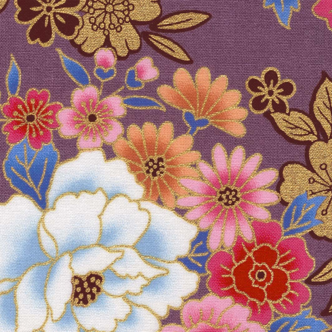 Tissu Japonais – Fleurs et Dorures – Mauve, Or, Rose, Orange et Bleu – T523