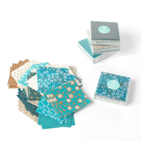 Ce joli set contient 100 carrés de papiers japonais washi, yuzen, chiyogami pour l’origami de 6cm de côté dans les tons dorés et bleu canard, de la gamme « Les Chics », sélectionnés par Adeline !