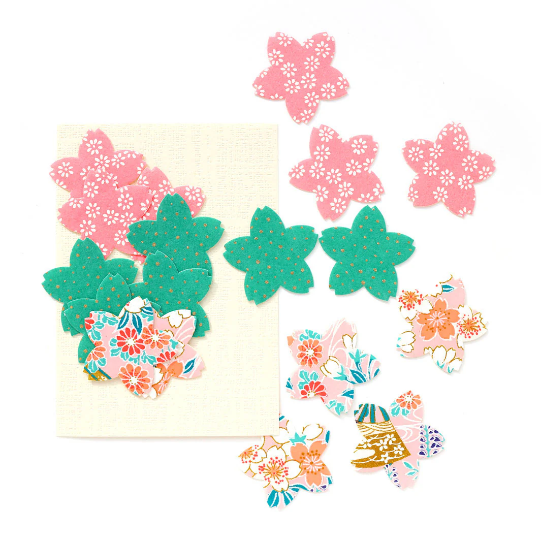 Ce lot contient 18 jolis autocollants en forme de fleurs de de cerisier (sakura) en papier japonais dans les tons rose clair, rose moyen, turquoise et vert menthe.