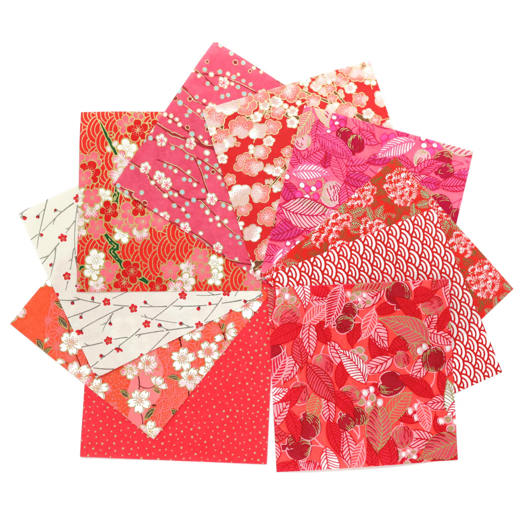 Ce joli set contient 20 carrés de papiers japonais (washi, yuzen, chiyogami) pour l’origami de 10cm de côté, dans les tons rouges, rouge orangé, corail, roses et rose fuschia, sélectionnés par Adeline !