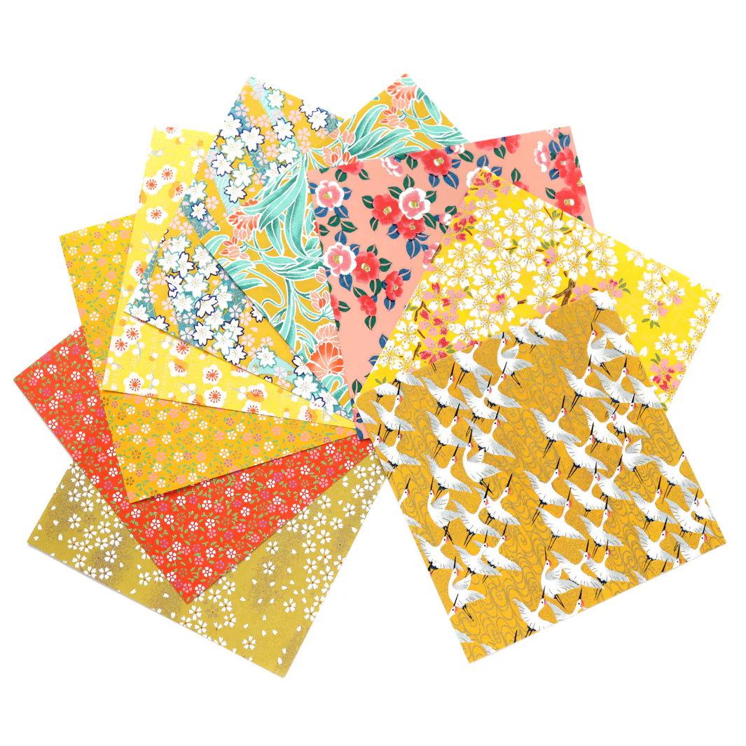 Ce joli set contient 20 carrés de papiers japonais (washi, yuzen, chiyogami) pour l’origami de 15cm de côté aux motifs dans des tons chauds de jaunes, d’orange, de rouges, de roses et de bleus, sélectionnés par Adeline !