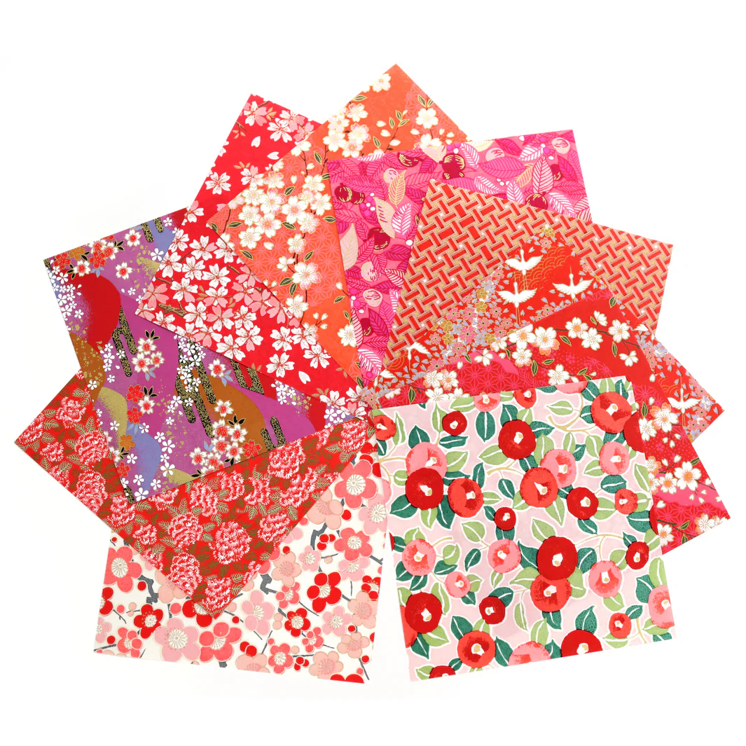 Ce joli set contient 20 carrés de papiers japonais (washi, yuzen, chiyogami) pour l’origami de 15cm de côté, dans les tons rouges, rouge orangé, corail, roses et rose fuschia, sélectionnés par Adeline !