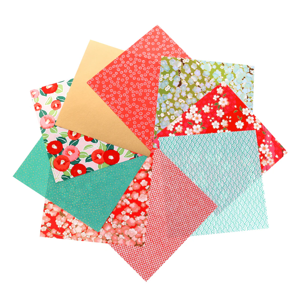 Ce joli set contient 20 carrés de papiers japonais (washi, yuzen, chiyogami) pour l’origami de 15cm de côté, dans des tons de rouges, de verts, de vert d’eau, de crème, d’argentés et de dorés de la gamme « Noël », imaginée par Adeline !