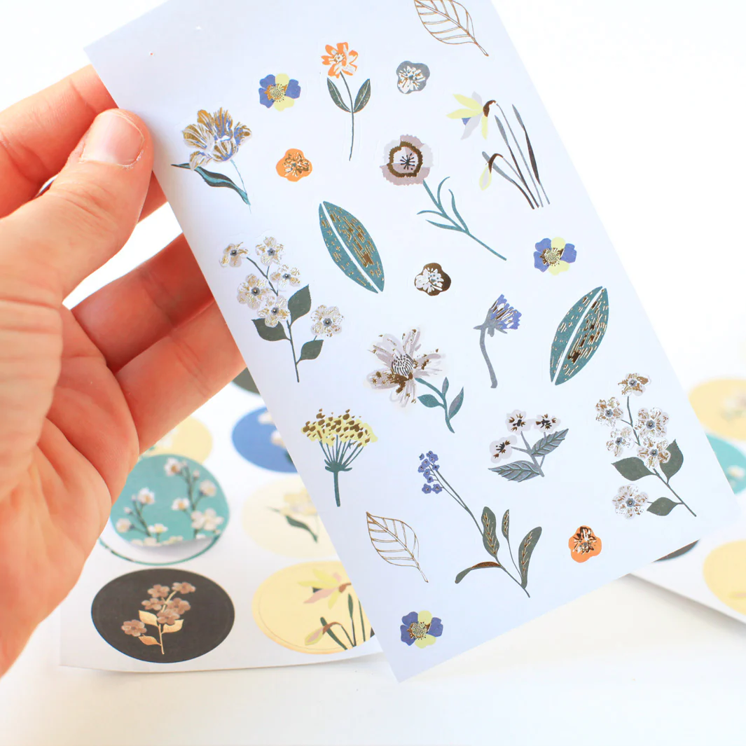 Jolies planches de 60 stickers aux motifs de fleurs chics et élégantes dans les tons bleus, verts, jaune et gris et aux détails dorés de la marque allemande Rico Design – Paper Poetry. Idéal pour décorer et customiser courriers, carnets en apportant une petite touche fleurie !