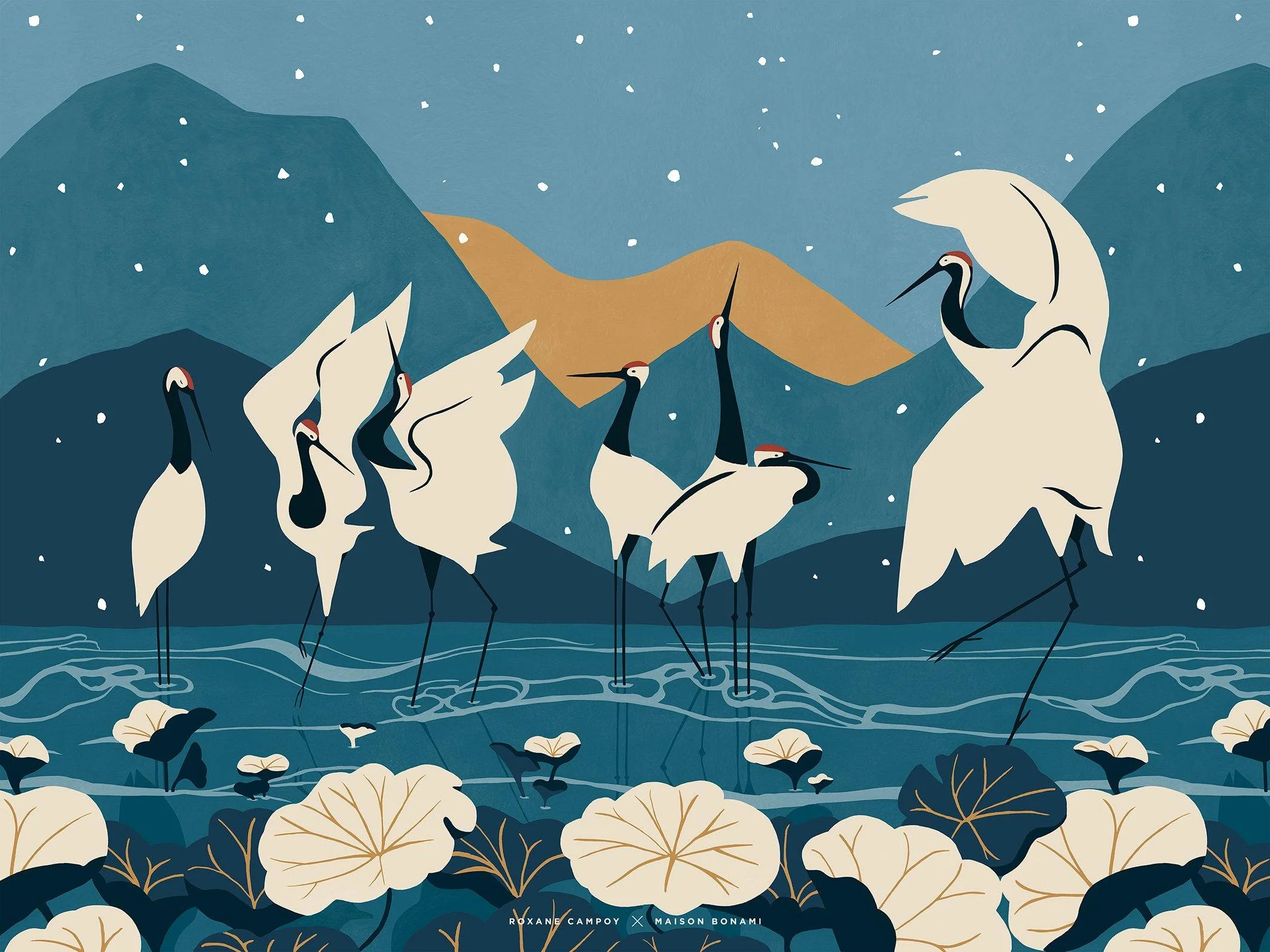 Véritable invitation au voyage, “Kyuuai Dansu” nous plonge au milieu d’un décor de grues hautes en couleur. Proposé ici dans sa version Bleu et Doré, cette affiche est issue de notre collaboration artistique avec l’illustratrice Roxane Campoy.