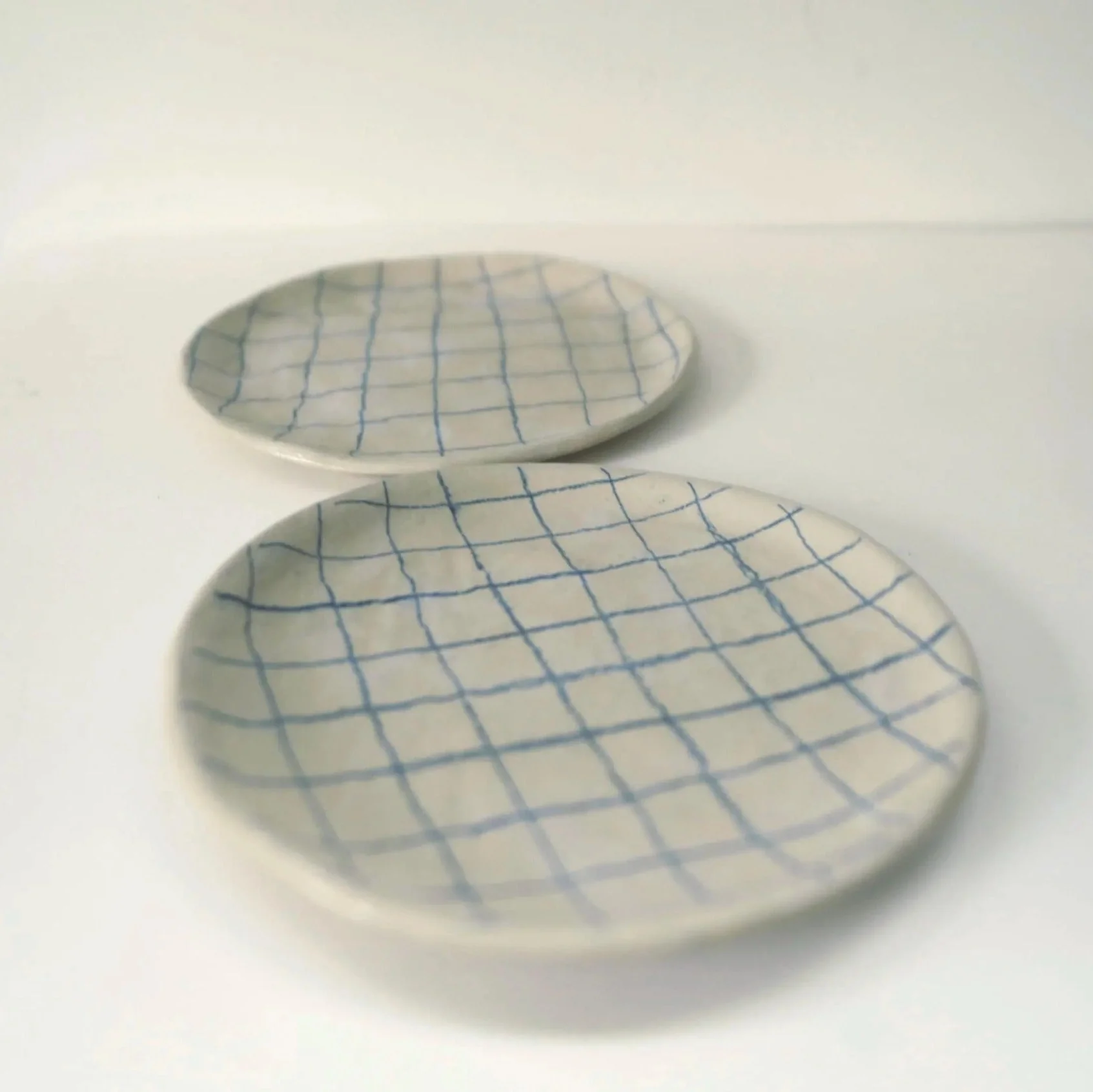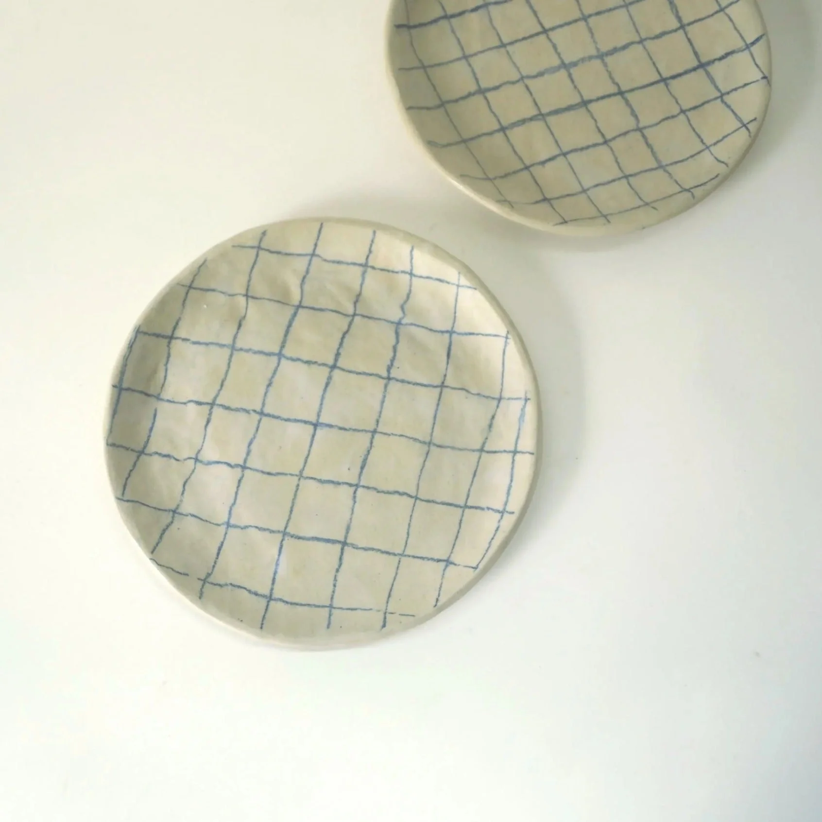 Cette assiette artisanale en grès céramique est entièrement faite à la main. Elle présente un élégant motif à carreaux bleus, dessiné au crayon céramique pour un rendu graphique subtil et unique.