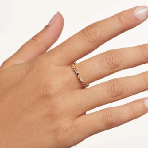 La bague Sage est caractérisé par les 5 pierres protagonistes colorées qui la décore. L’argent sterling 925 avec un placage d’or 18k est combiné à du bleu saphir corindon, de la rhodolite, du jaune d’or, du blanc pur et des teintes champagne qui font de la pièce un bijou délicat, reprenant la beauté naturelle de la faune.