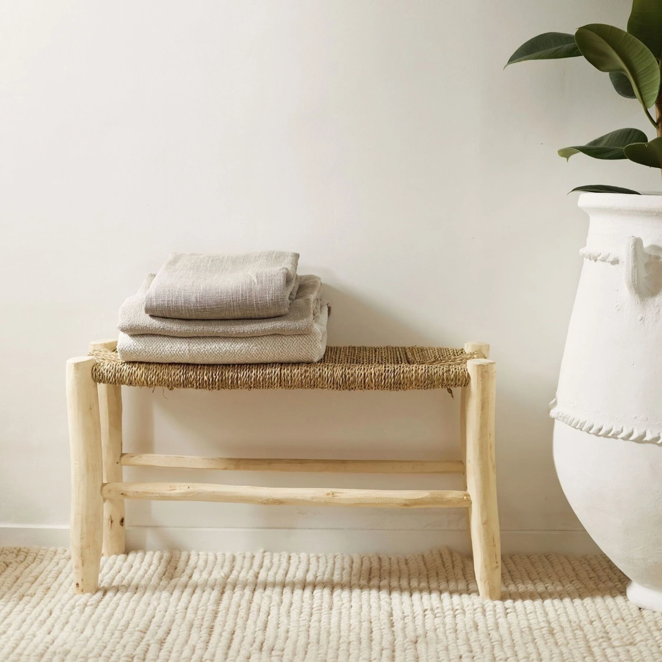 Traditionnel banc marocain en bois de laurier brut et feuilles de palmier séchées, roulées puis tressées à la main pour constituer l’assise.