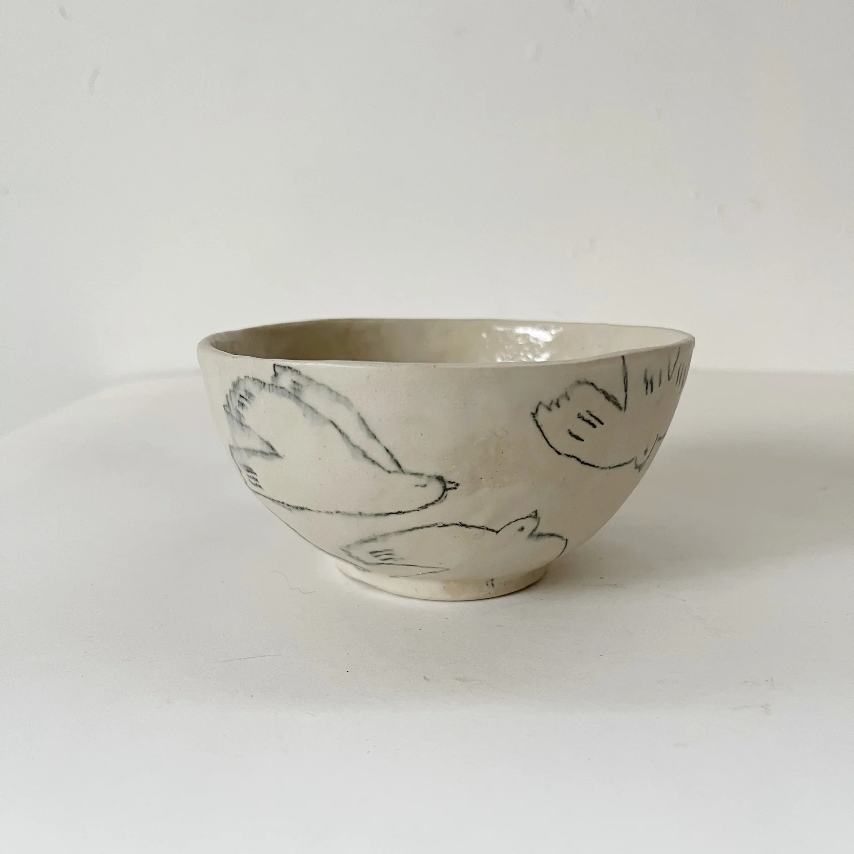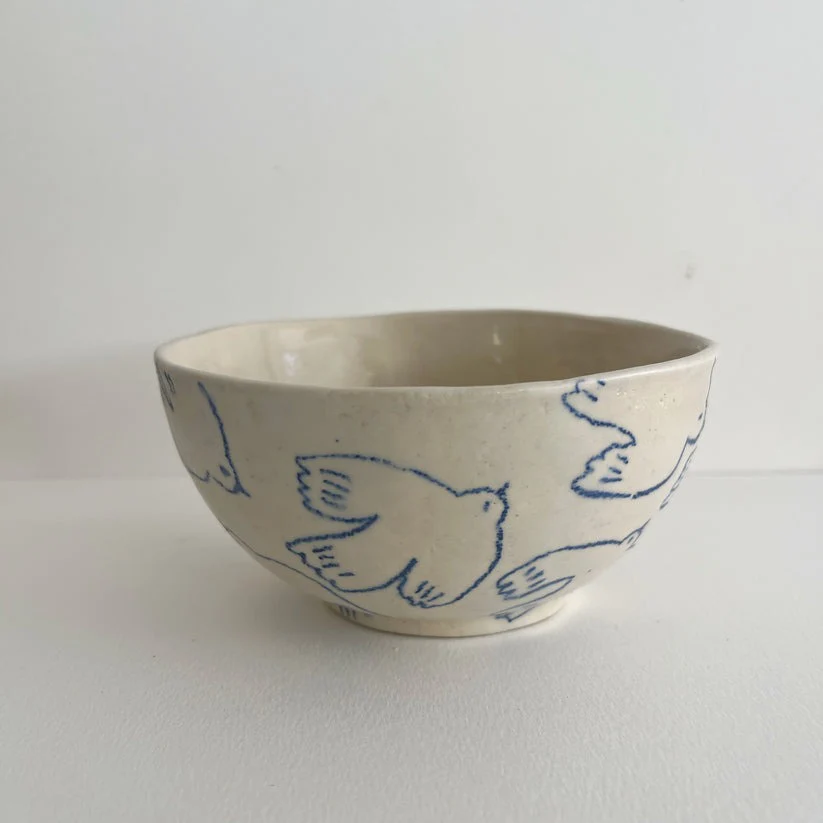 Ce bol artisanal en grès céramique est entièrement fait à la main. Elle présente un motif délicat d’oiseaux, dessiné au crayon céramique pour un rendu graphique subtil et unique.