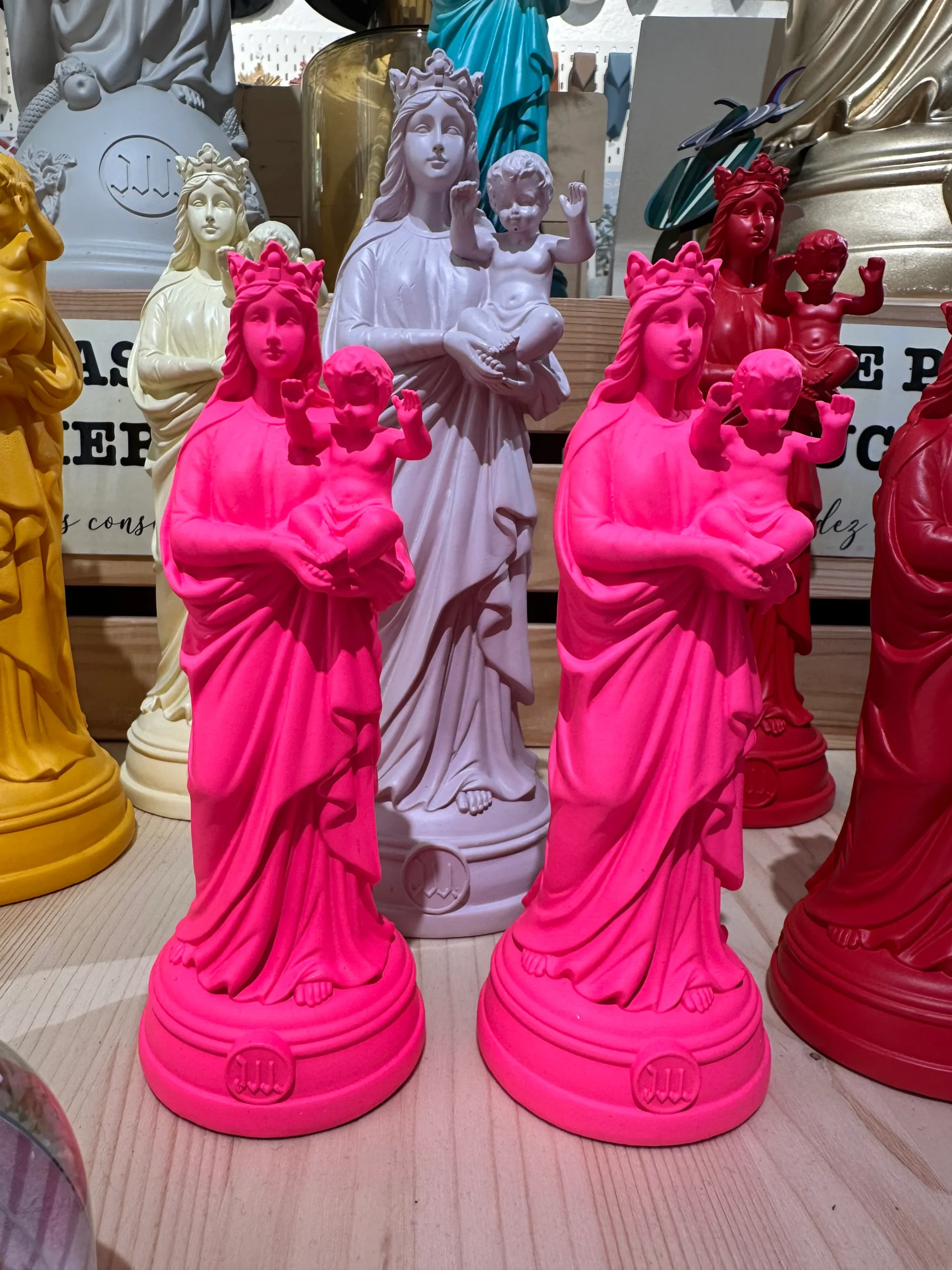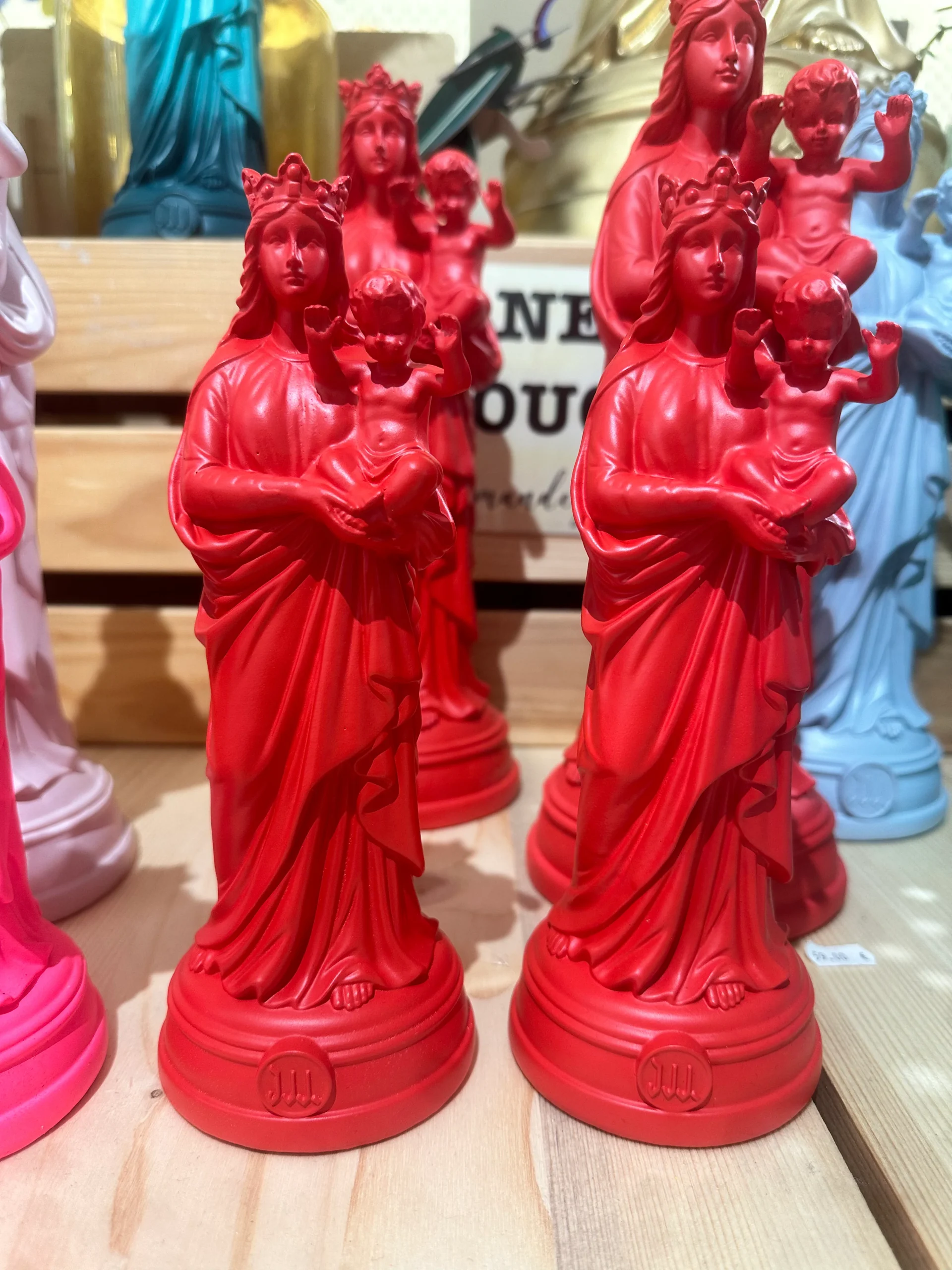 Voici la statuette de la Vierge à l’Enfant, celle qui surplombe la basilique Notre-Dame de la Garde. La Bonne Mère, comme l’appellent affectueusement les Marseillais est ici une reproduction des plus fidèles, moulée en résine et couverte de couleur. Des couleurs qui évoluent, comme dans la mode, en fonction des saisons et des tendances.
