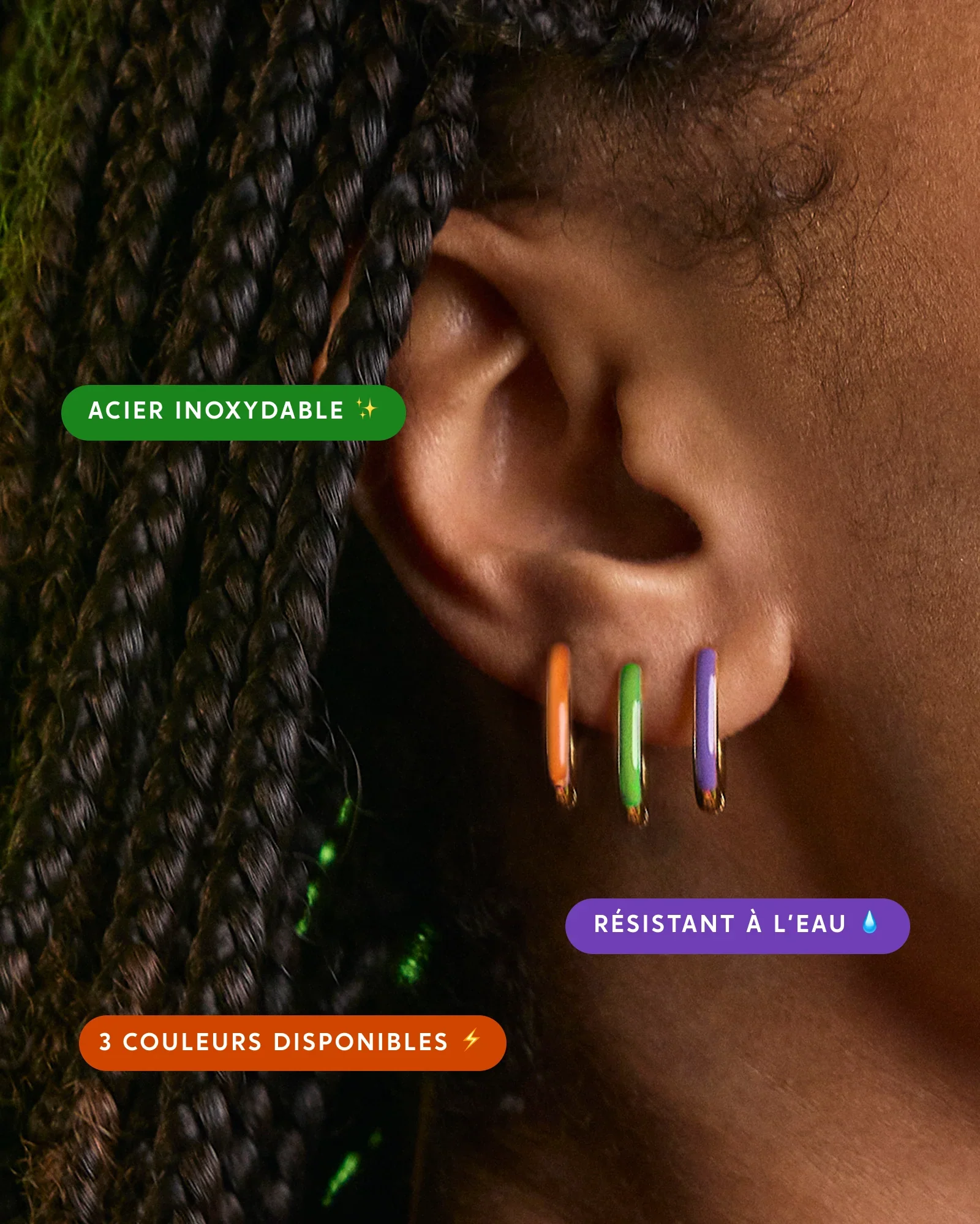 Une touche colorée et audacieuse d’un côté, une élégance intemporelle de l’autre : en les retournant, elles se transforment en créoles rectangulaires dorées, parfaites pour tous les looks.