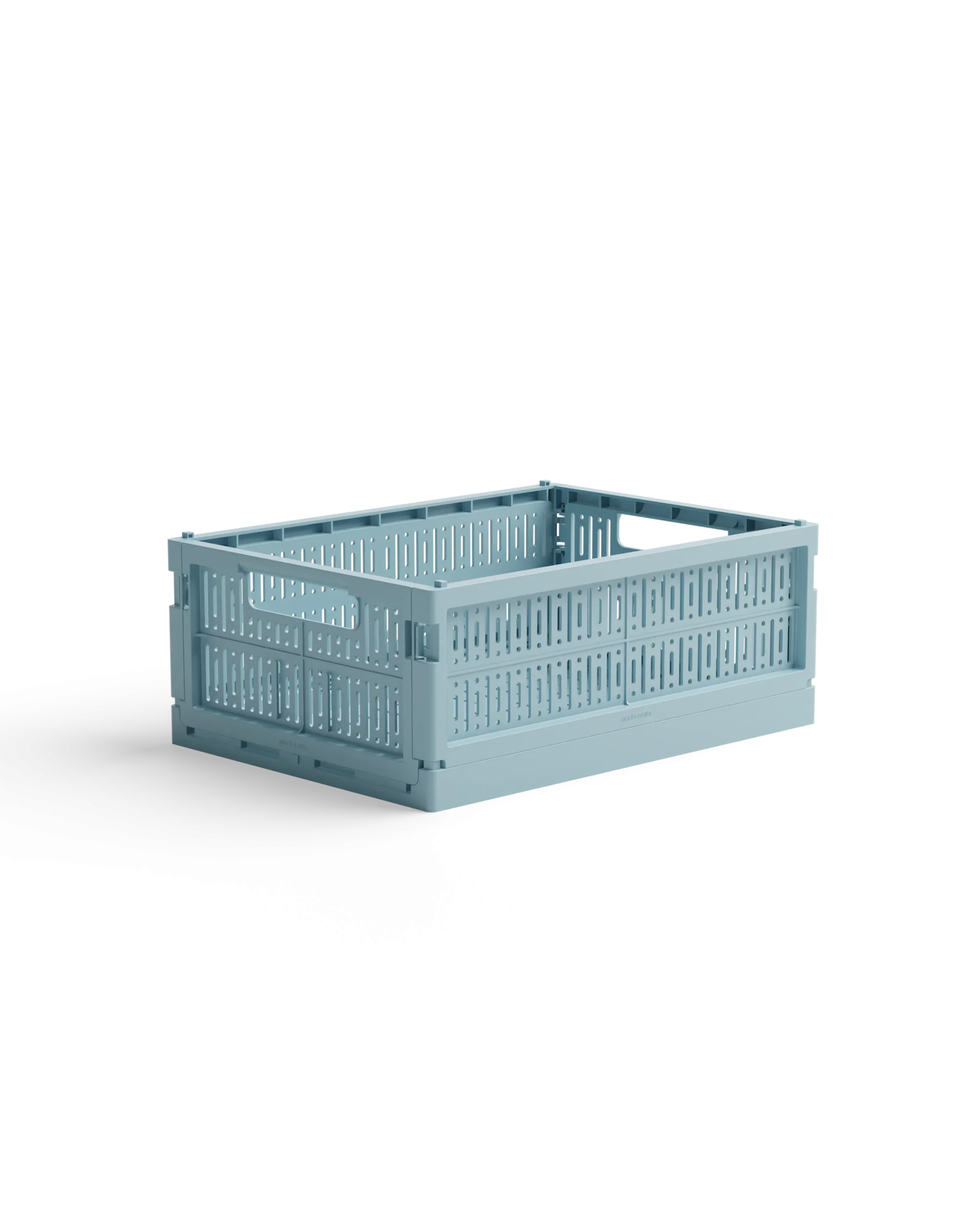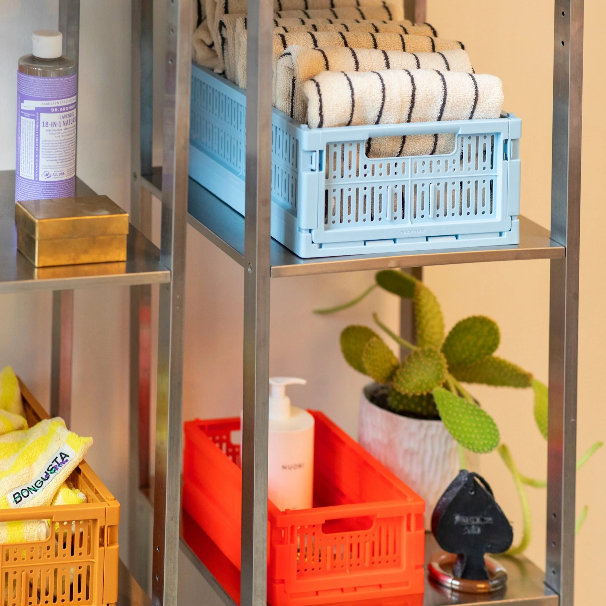 Les caisses Made Crates sont empilables entre leurs trois tailles : deux caisses midi s’empilent sur une maxi, et deux mini sur une midi. De cette façon, elles se « verrouillent » les unes sur les autres et restent bien stables sur vos étagères.