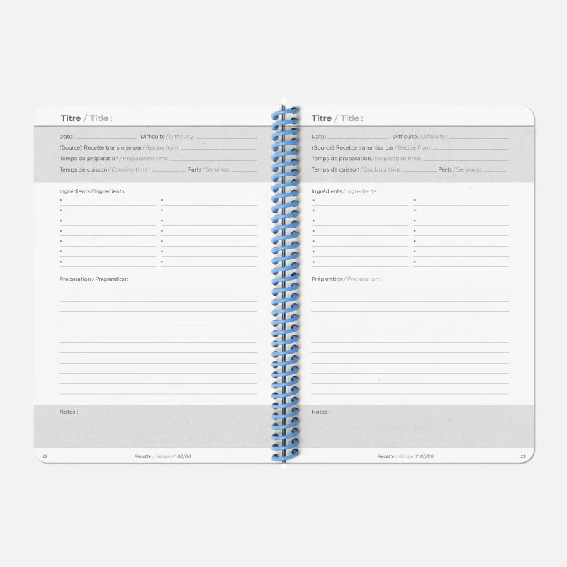 Au format A5, il se glisse facilement dans un tiroir de cuisine ou un sac, prêt à être ouvert à tout moment pour noter une nouvelle idée ou suivre une recette fétiche. Sa reliure robuste et sa couverture rigide permettent d’écrire confortablement, que vous soyez à table ou sur un plan de travail.