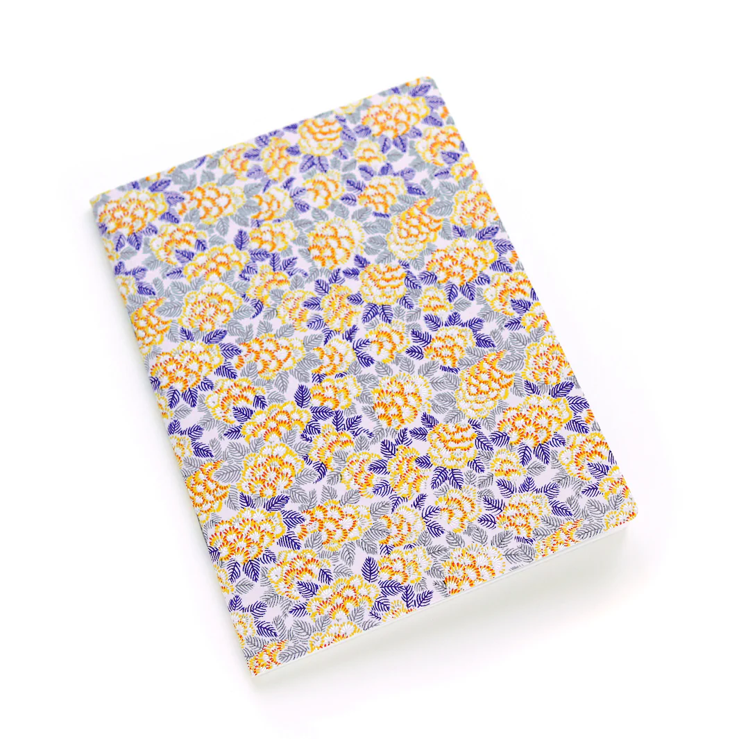 Ce carnet est recouvert d’un joli papier japonais aux motifs de fleurs, d’oiseaux et de papillons dans les tons rouges, mauves, vert clair et foncé sur fond bleu marine.