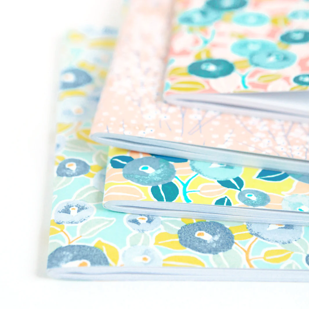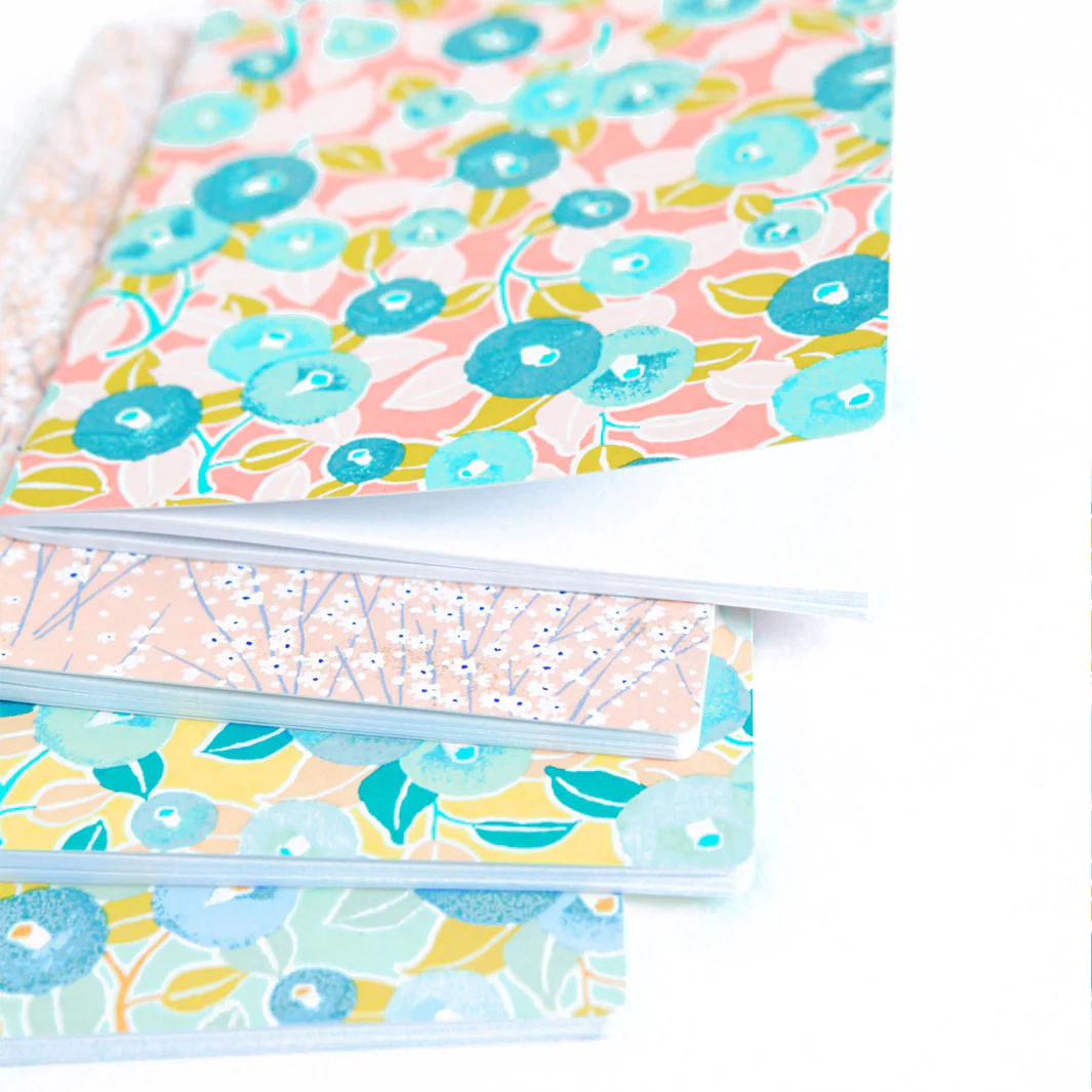 Joli carnet tapissé de papier japonais aux motifs de camélia dans les tons verts d’eau, turquoises, saumons et jaunes. Idéal pour dessiner, prendre des notes !