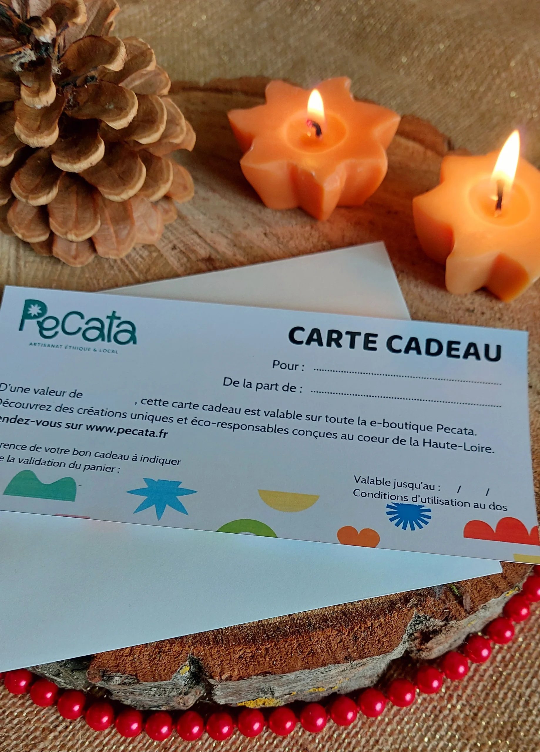 La carte cadeau Pecata est la solution idéale pour faire plaisir à vos proches, qu’ils soient loin ou près de vous. Avec ce bon cadeau vous êtes sûr d’offrir un cadeau unique, original et personnalisé. Vos proches vont pouvoir créer leur propre coffret cadeau parmi un large choix de créations artisanales toutes fabriquées avec talent en Haute-Loire.