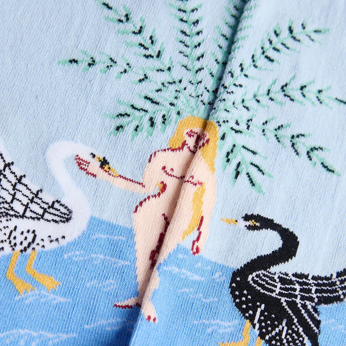 Chaussettes unisexes casual bleu clair représentant deux personnages classiques et d’autres éléments oniriques.