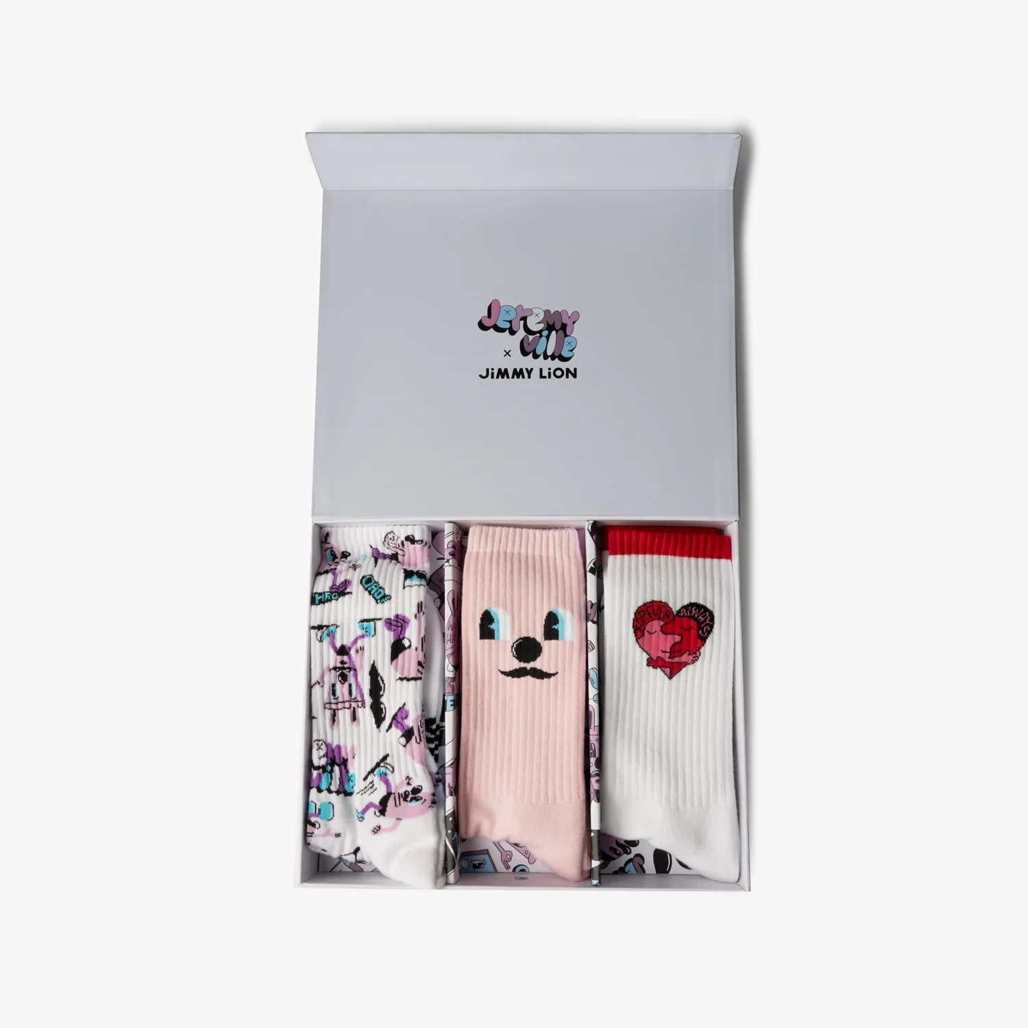 Quelques-unes des illustrations les plus populaires de l’artiste Jeremyville se réunissent dans un pack cadeau très spécial qui transmettra positivité et bonne humeur. Avec des motifs romantiques et des couleurs pastel, cette sélection de chaussettes apportera une touche originale et authentique à vos looks.