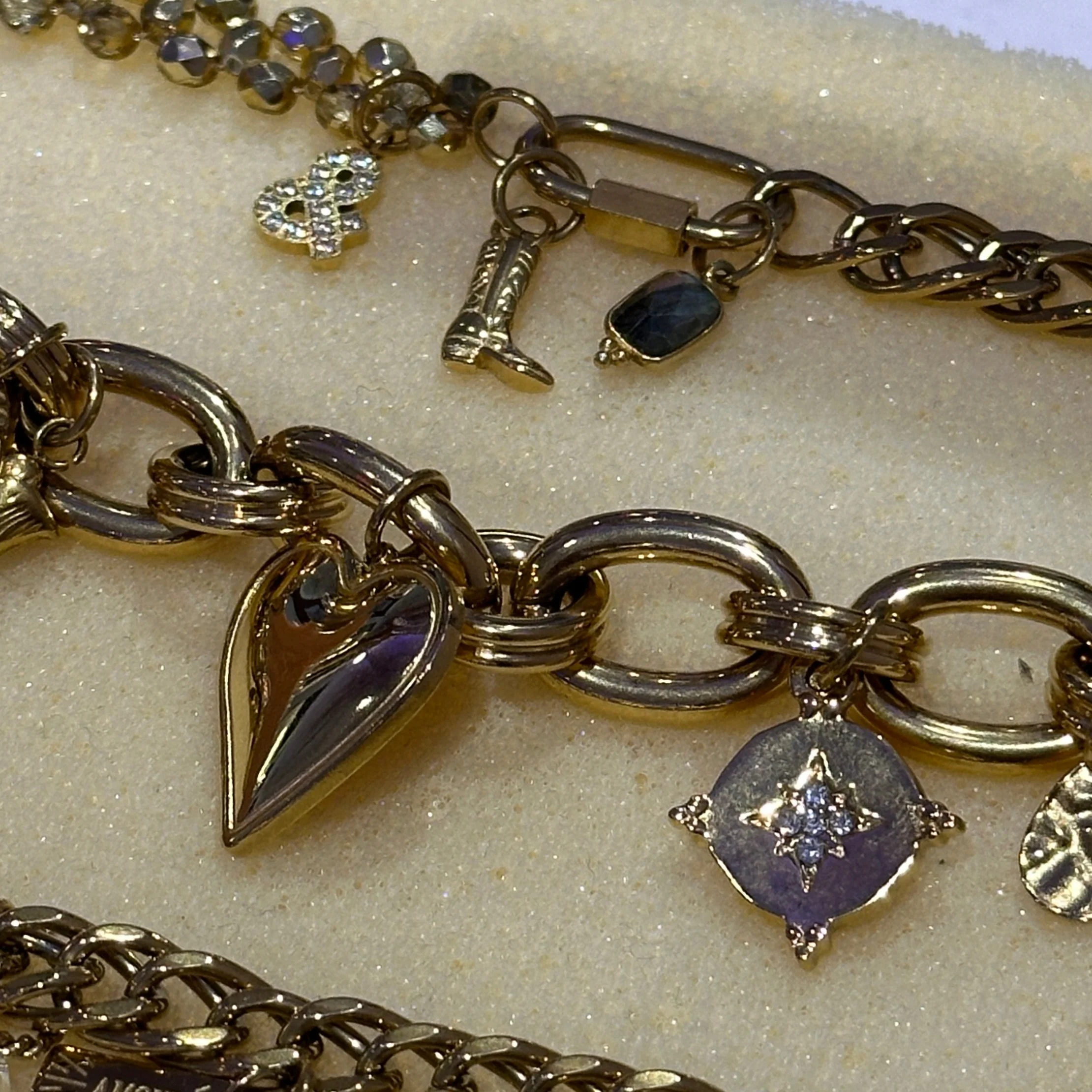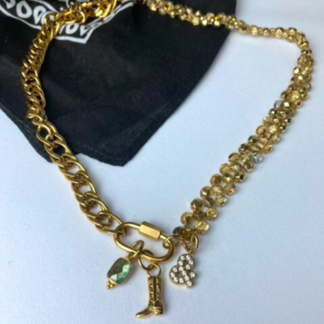 Le pendentif mousqueton ainsi que la boots sont en acier inoxydable doré. Le pendentif & est en acier inoxydable, recouverts de zirconium blanc. La pierre du 3ème pendentif est une Labradorythe.