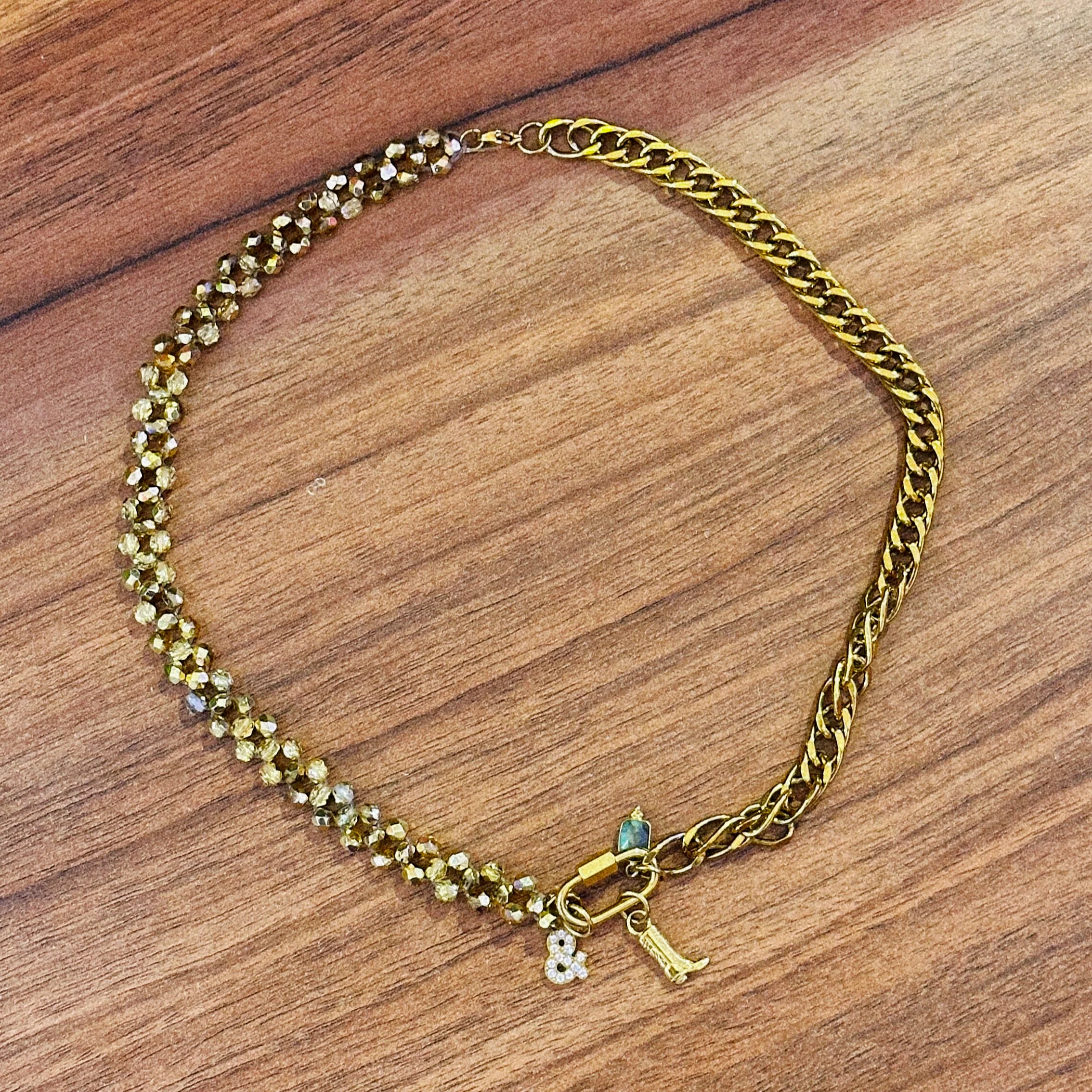 Le collier Dollie *1 est composé d’une chaîne maille gourmette en acier inoxydable doré et de perles en verre à facettes teintées de couleur or. Ces perles sont tissées à la main.