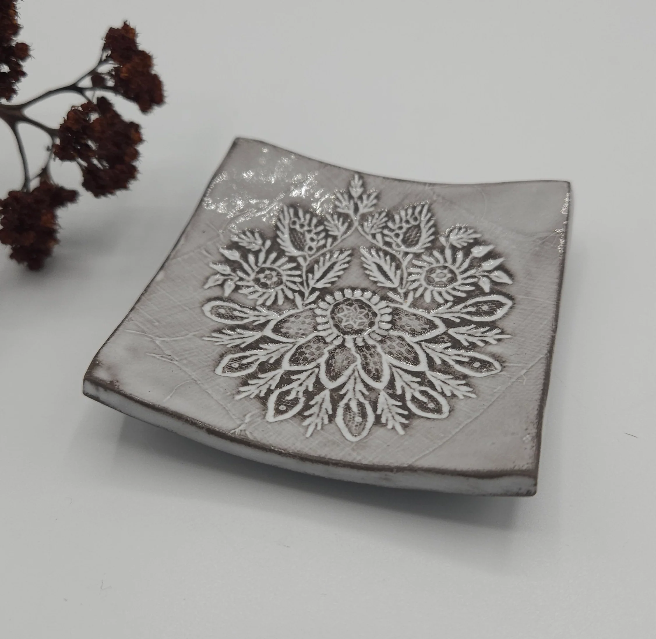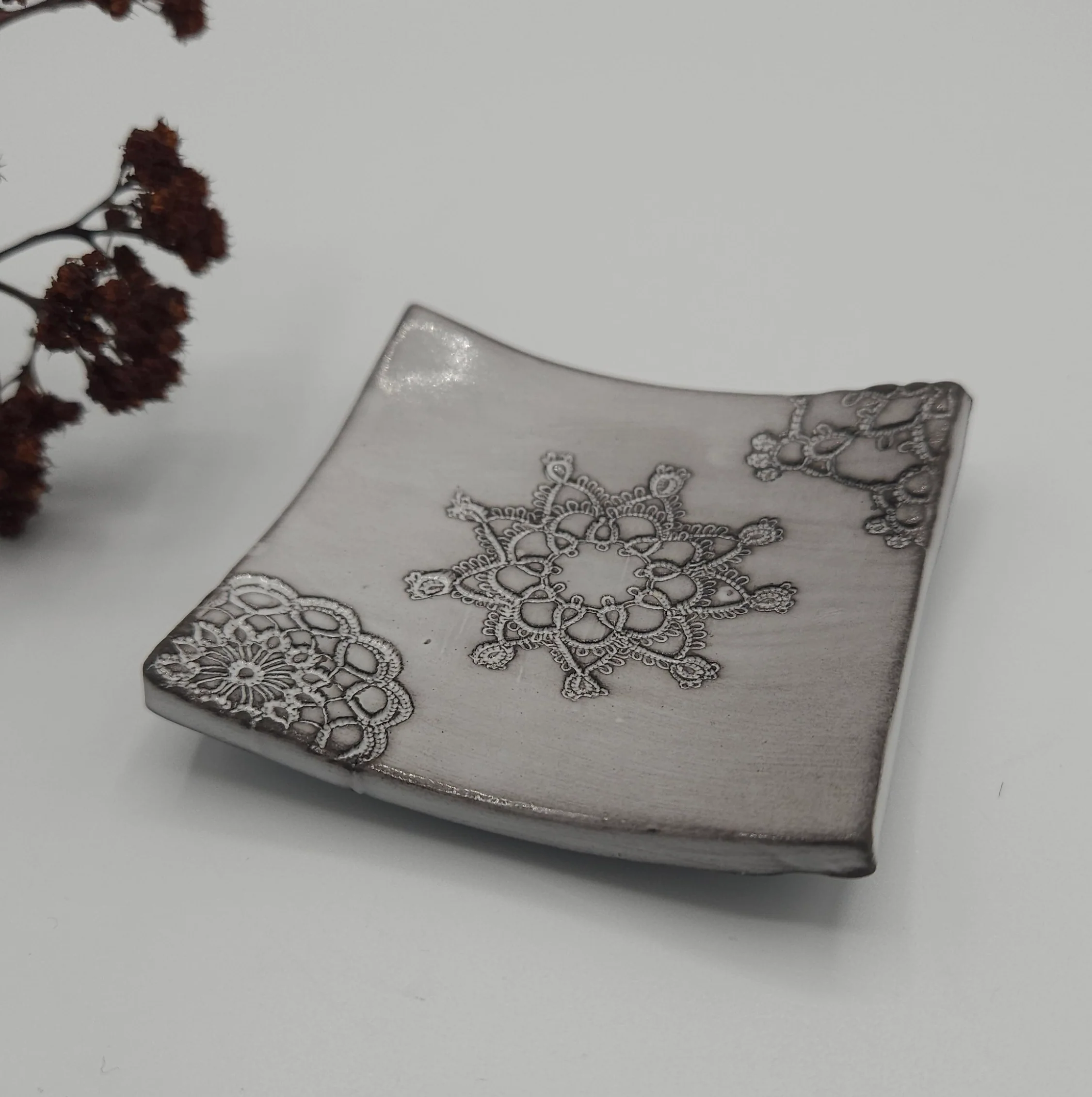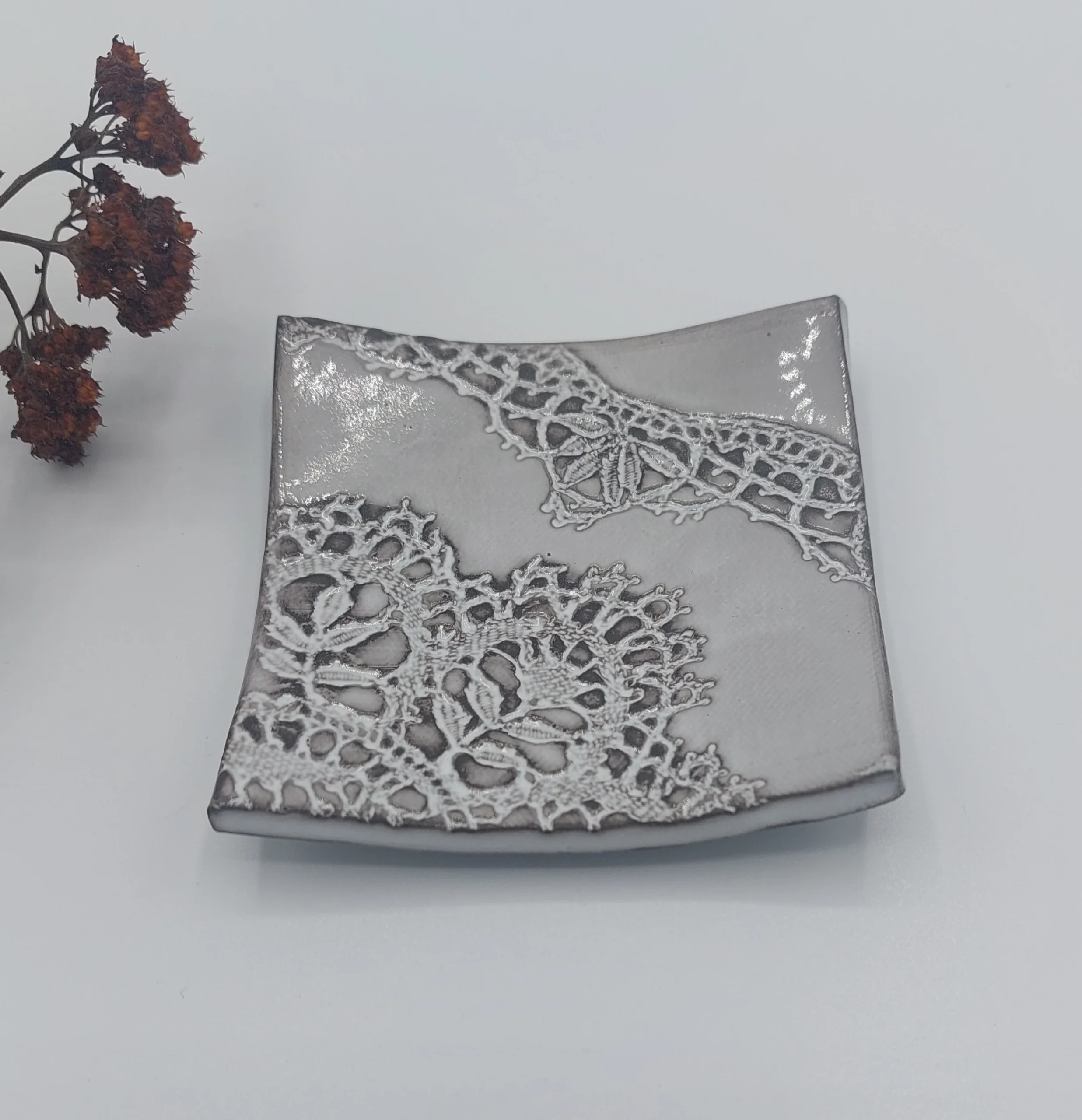 Chaque coupelle est une pièce unique, façonnée artisanalement et ornée d’une empreinte délicate de dentelle, hommage au savoir-faire local des dentelières de Haute-Loire.