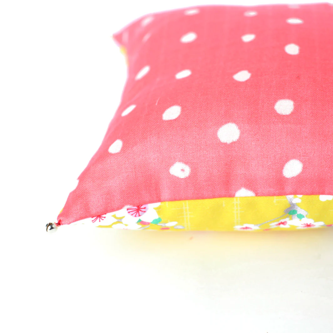Joli coussin en tissus japonais dans les tons jaunes et roses, avec motifs de fleurs de cerisier (sakura) blanc et roses et pois vert sur fond jaune à motifs géométrique rétro.