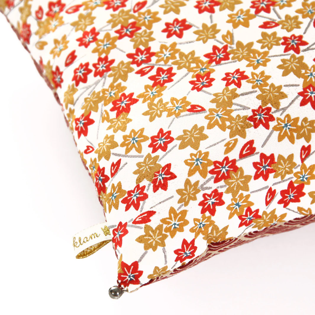 Joli coussin en tissus japonais dans les tons beiges, jaunes moutarde et rouges brique aux motifs de feuilles d’érable rouges et jaunes moutarde et aux branches grises sur fond blanc cassé et de vagues (seigaiha) rouges brique sur fond beige, et grelots argentés.