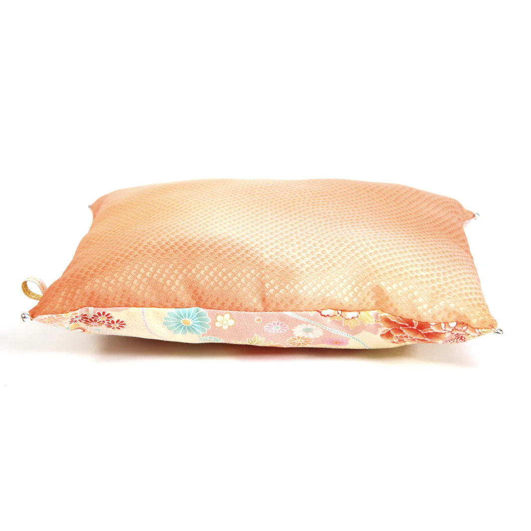 Joli coussin en tissus japonais dans les tons jaunes et roses pâles, bleus ciel et corail aux motifs de camélias, de chrysanthèmes et de fleurs de prunier et cordelettes aux couleurs variées, nuages roses clair sur fond jaune pâle et d’écailles corails tons sur tons et grelots argentés.