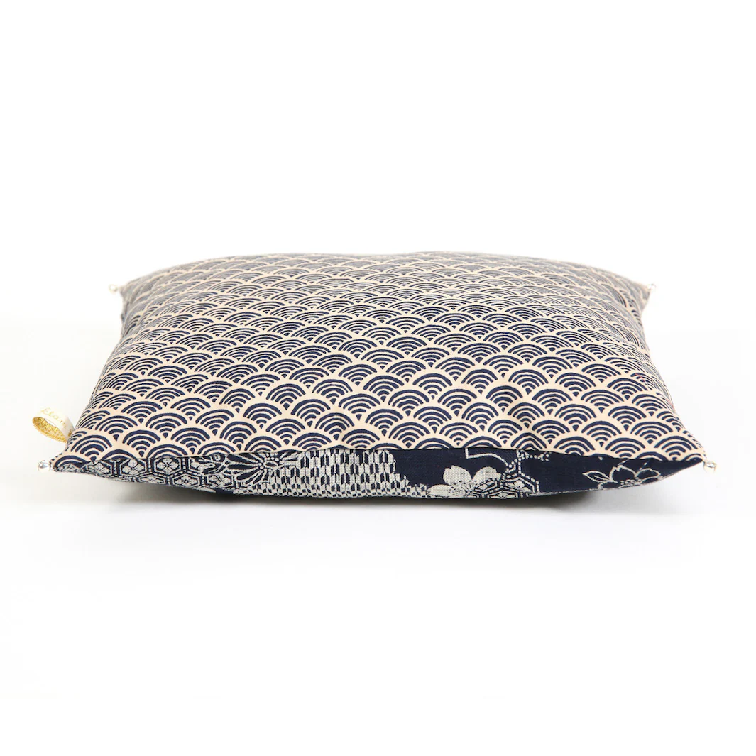 Joli coussin en tissus japonais dans les tons bleu marines et beiges aux motifs variés japonais blanc sur fond bleu marine foncé et vagues bleues marines sur fond beige et grelots argentés.