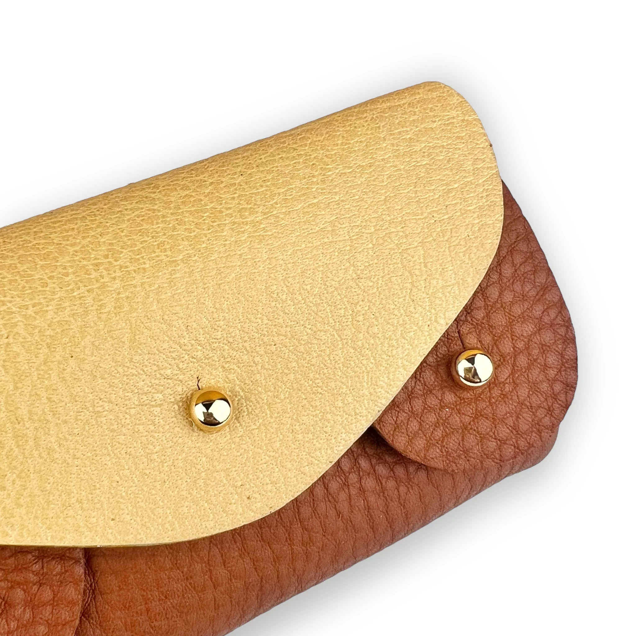• Coloris doré clair effet miroir, et caramel, embossage effet croco