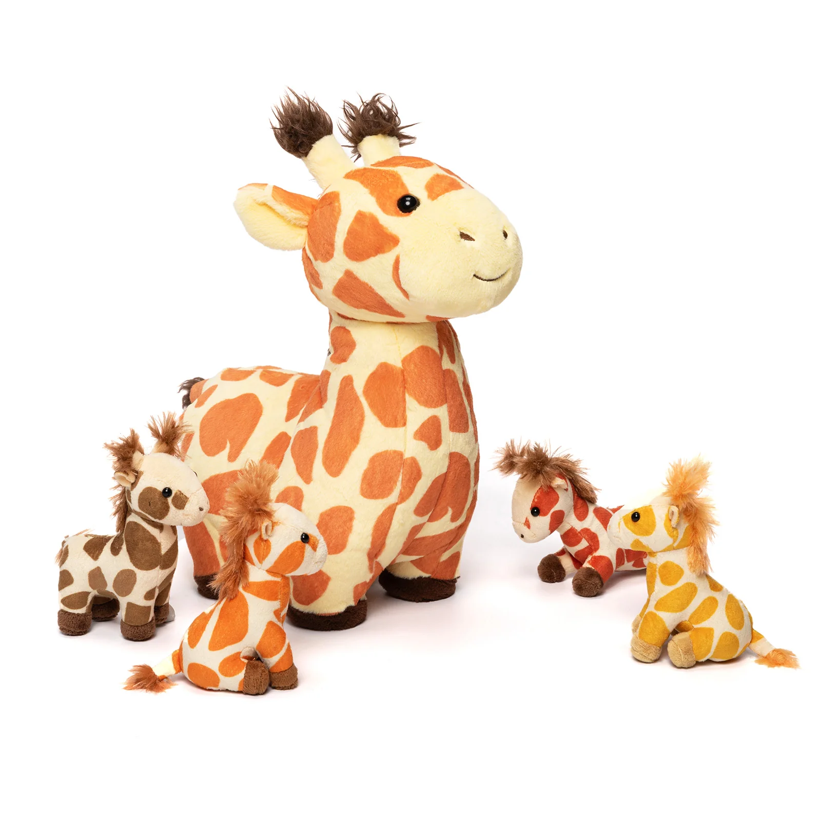 Cet ensemble de jeu doux comprend un sac girafe en peluche de 32 cm pour ranger 4 bébés girafe doux,
