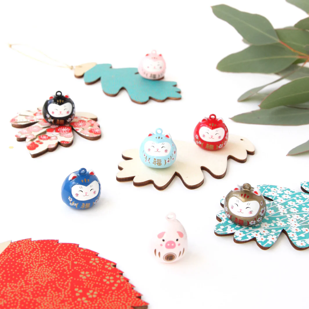 Gros grelot en forme de chat (neko) et de daruma (porte-bonheur japonais traditionnel représentant une figure de moine bouddhiste) bleu roi aux détails roses, rouges, noirs et dorés.