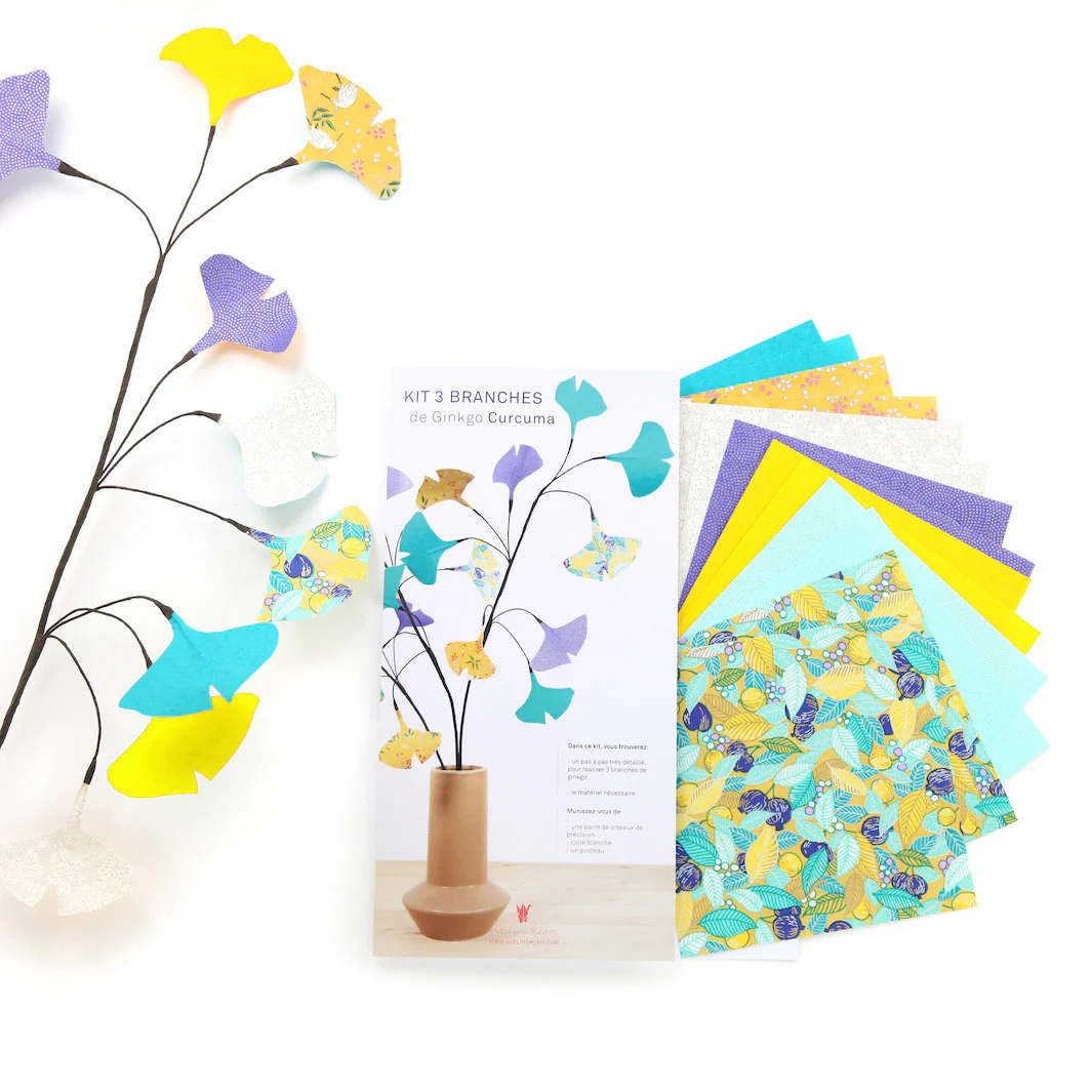 Ce joli kit créatif pour apprendre à réaliser de ravissantes branches de ginkgo en papier japonais dans les tons jaune moutarde, bleu turquoise, bleu canard et violets de la gamme « Curcuma », a été imaginé par Adeline.
