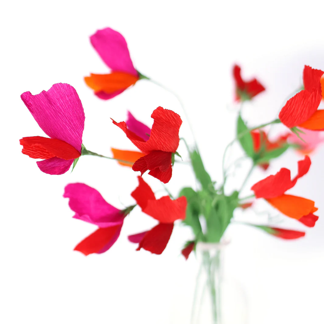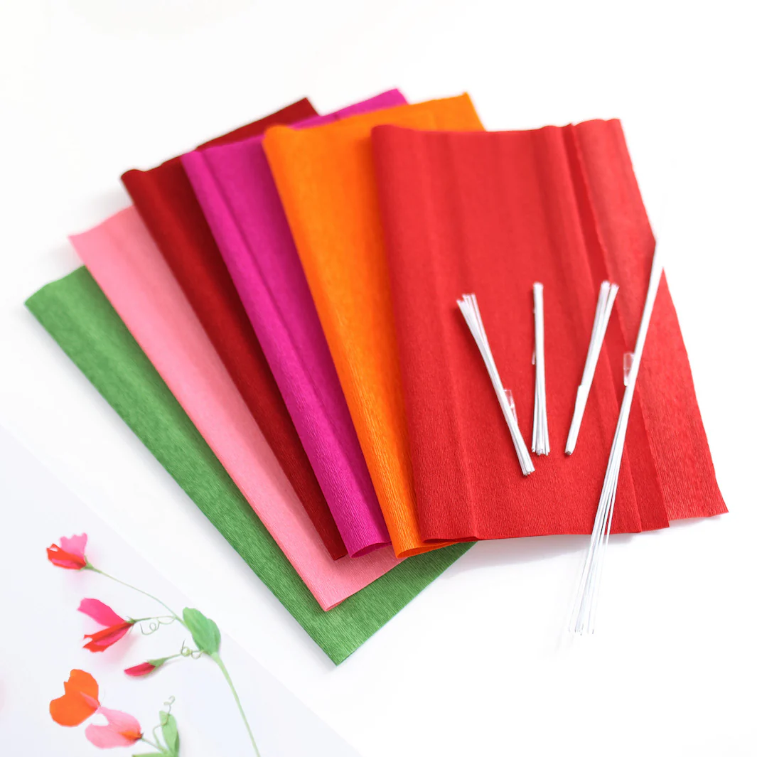 À l’aide de ce kit créatif, apprenez à réaliser un élégant bouquet de pois de senteur en papier crépon dans différents tons de rouge carmin, de rouge foncé, de rose fuchsia foncé, de rose et de orange moyen et de vert feuille !
