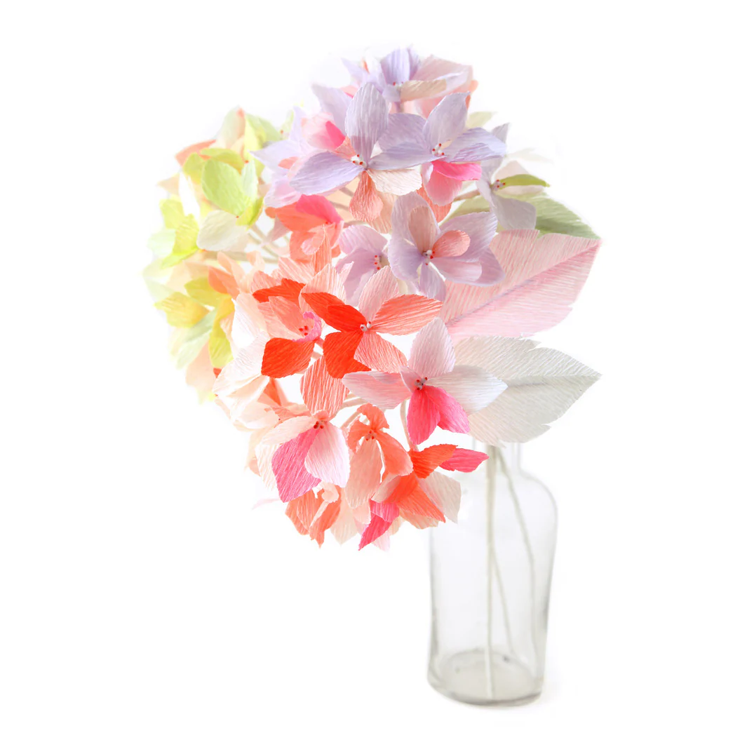 Ce joli kit créatif pour apprendre à réaliser trois boules d’hortensia en papier crépon dans différents tons de roses clairs, de corail, de mauves et lilas clairs et de jaunes et verts acidulés de la gamme « Rainbow », a été imaginée par Adeline !
