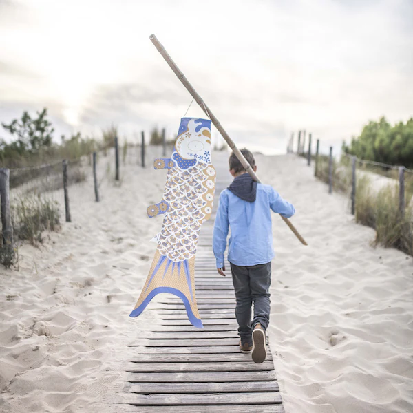 Ce poisson volant japonais est traditionnellement hissé le 5 mai au Japon lors de la fête des enfants Kodomo no hi (de kodomo, enfant, no, de et hi, jour).