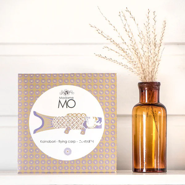 Ce koinobori (du japonais koi, carpe et nobori, drapeau/bannière) est une manche à air poisson en tissu de la marque Madame Mo, de couleur lilas, doré et blanc.