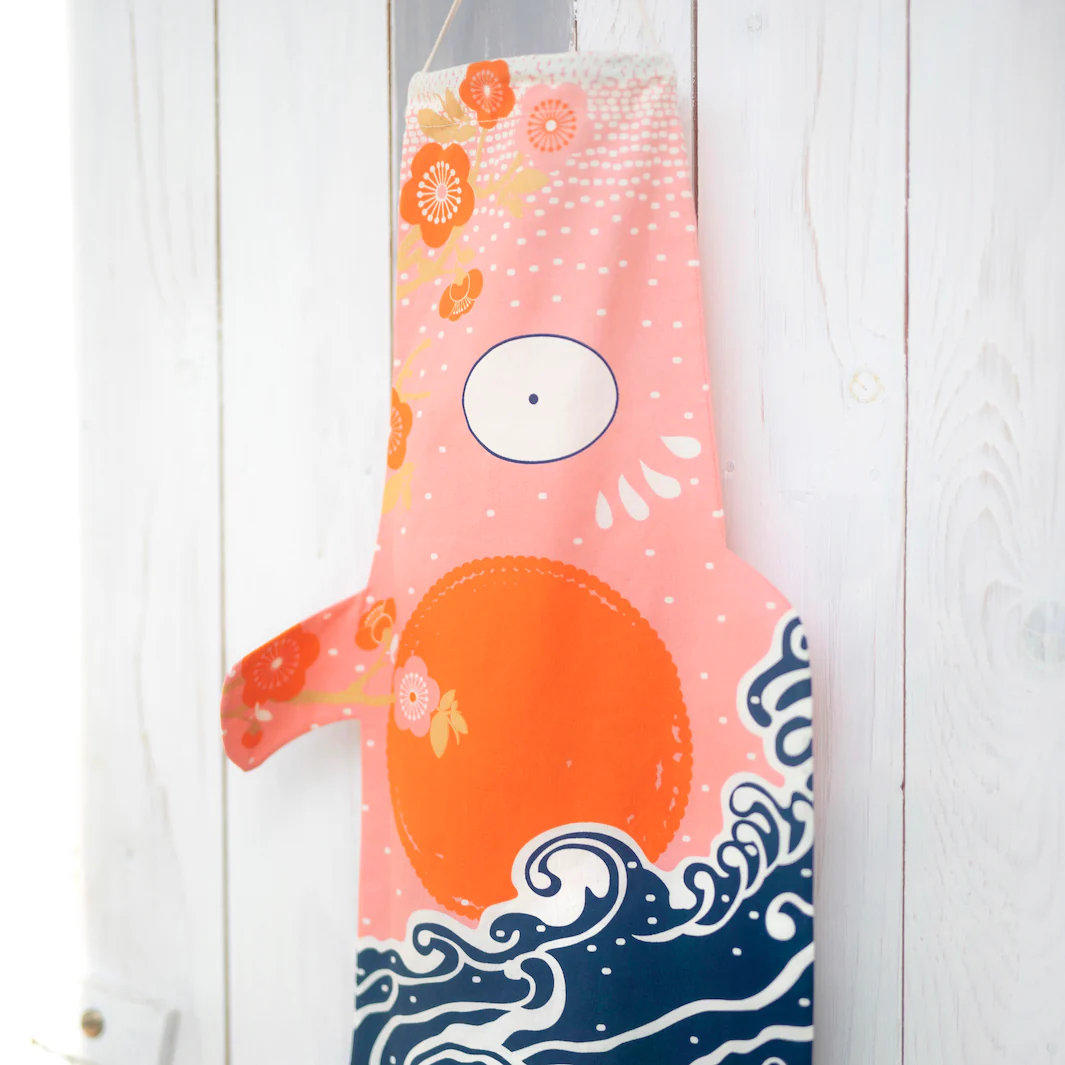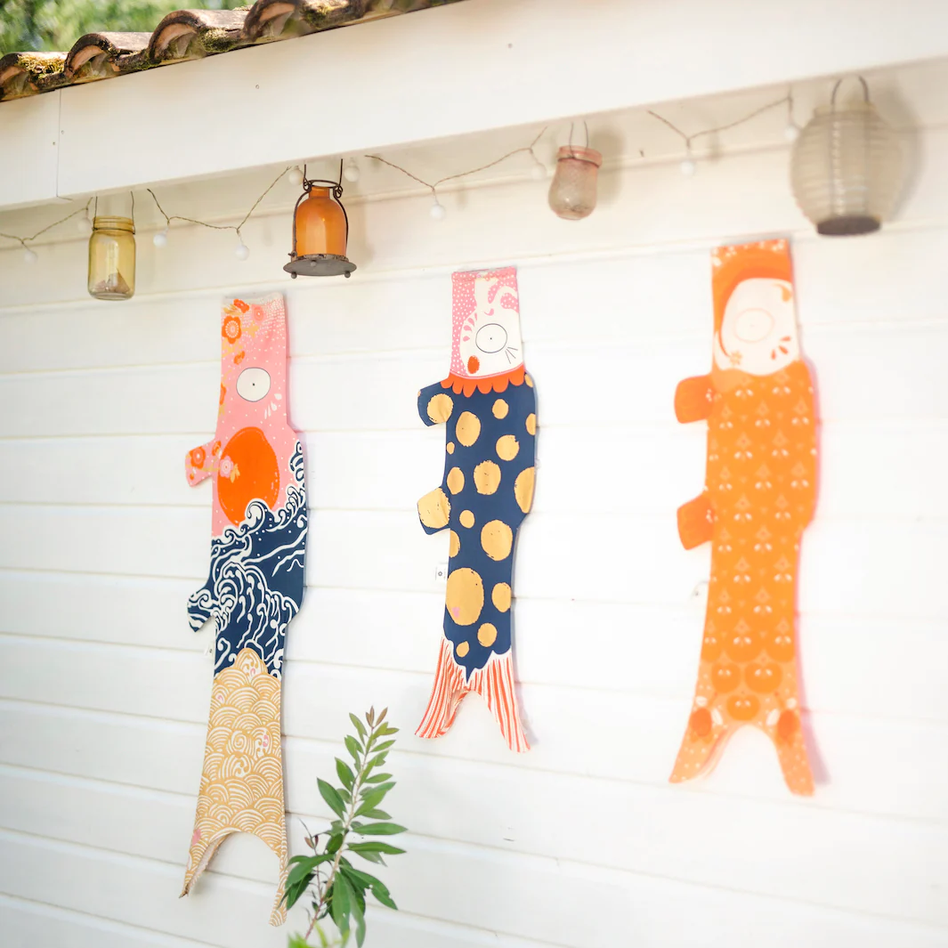 Ce koinobori bleu, rose et doré au motif de vague japonaise (du japonais koi, carpe et nobori, drapeau/bannière) est un poisson volant japonais en tissu de la marque Madame Mo.