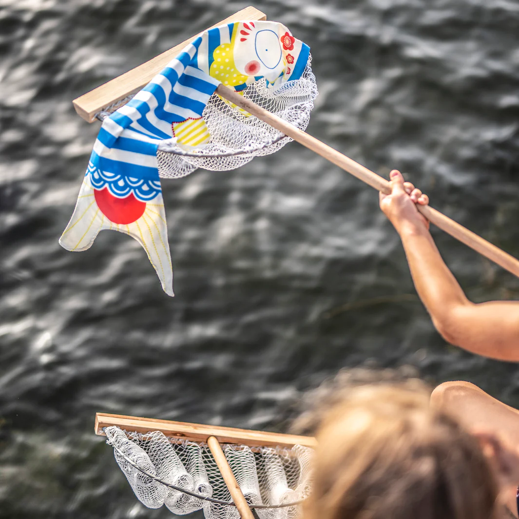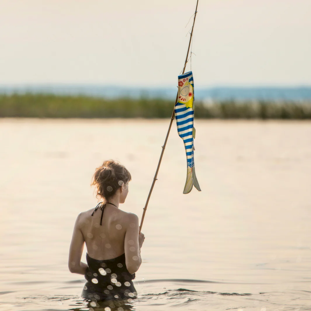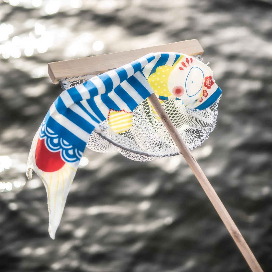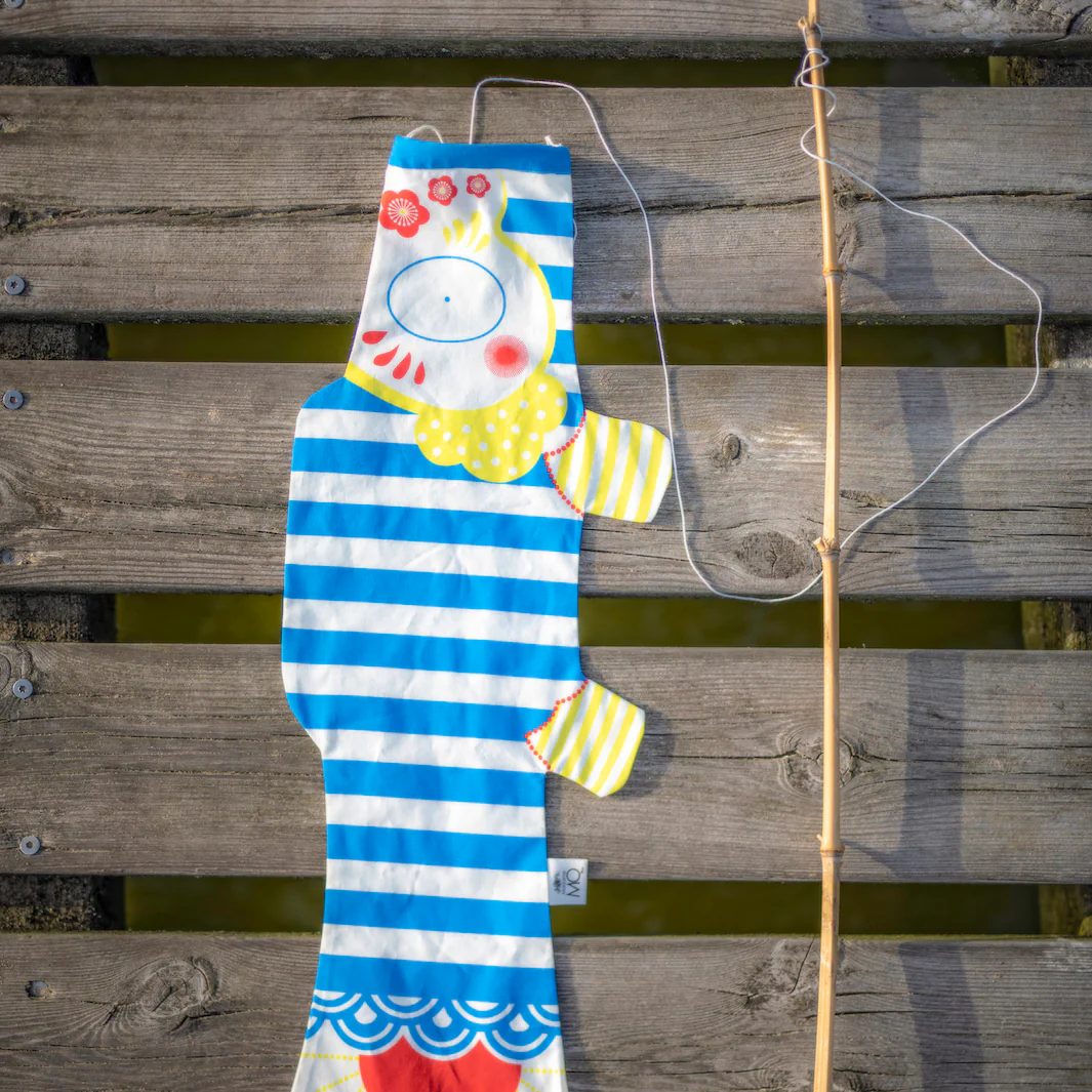 Ce koinobori (du japonais koi, carpe et nobori, drapeau/bannière) rayé bleu et crème aux détails jaunes et rouges est un cerf-volant japonais en tissu de la marque Madame Mo.