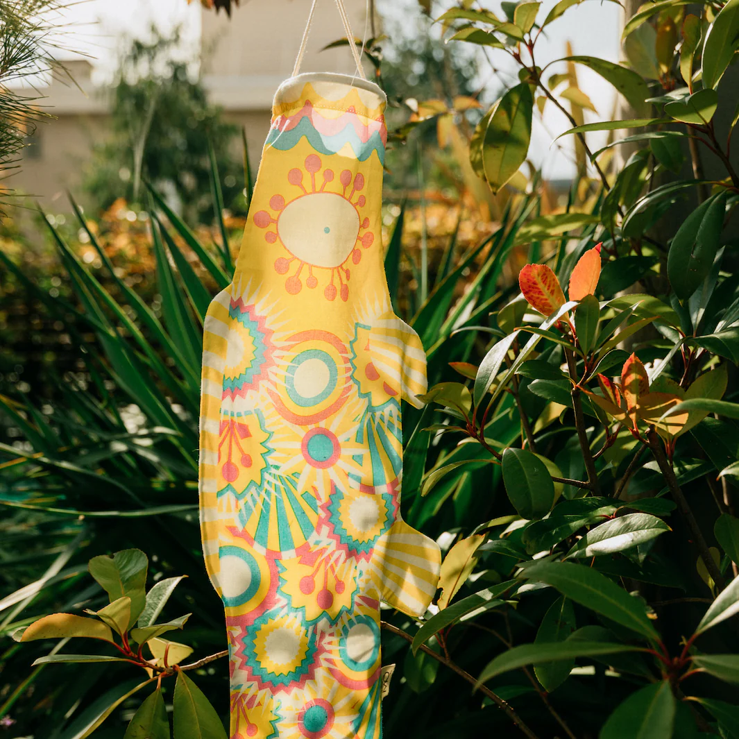 Ce manche à air en tissu jaune, rose, bleu turquoise et blanc est un koinobori (du japonais koi, carpe et nobori, drapeau/bannière) de la marque Madame Mo en collaboration avec la créatrice japonaise Yukari.