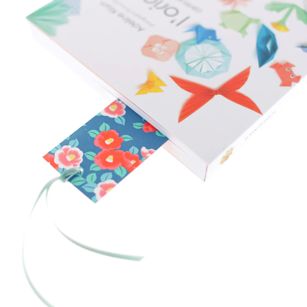 Ce joli marque-page est fabriqué avec des papiers japonais aux motifs de camélias tsubaki et de samekomon, dans les tons bleu foncé, rouge orange, roses, vert d’eau et orange pastel.