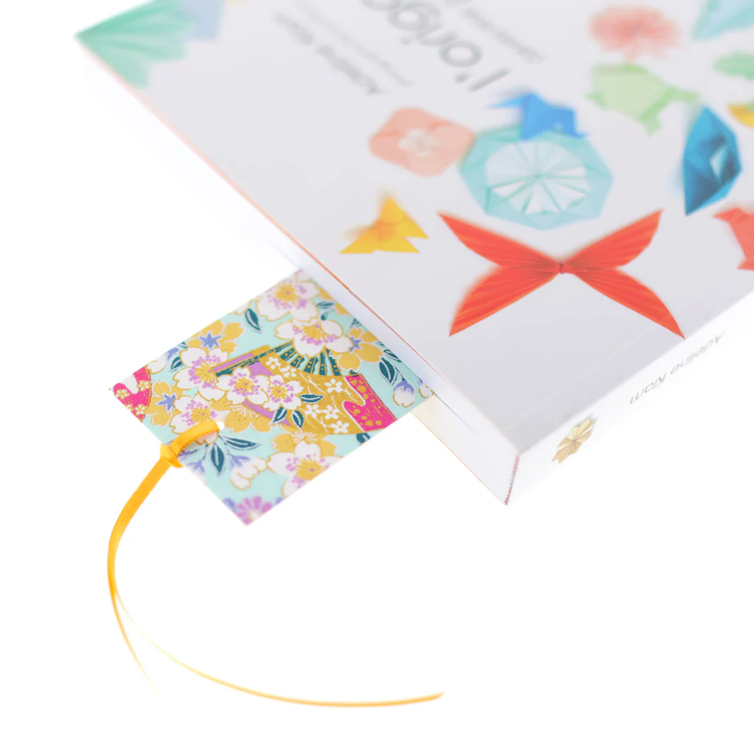 Ce joli marque-page est fabriqué avec des papiers japonais aux motifs de fleurs de cerisier, de glycine et de kanoko, dans les tons vert d’eau, parme et jaune moutarde.