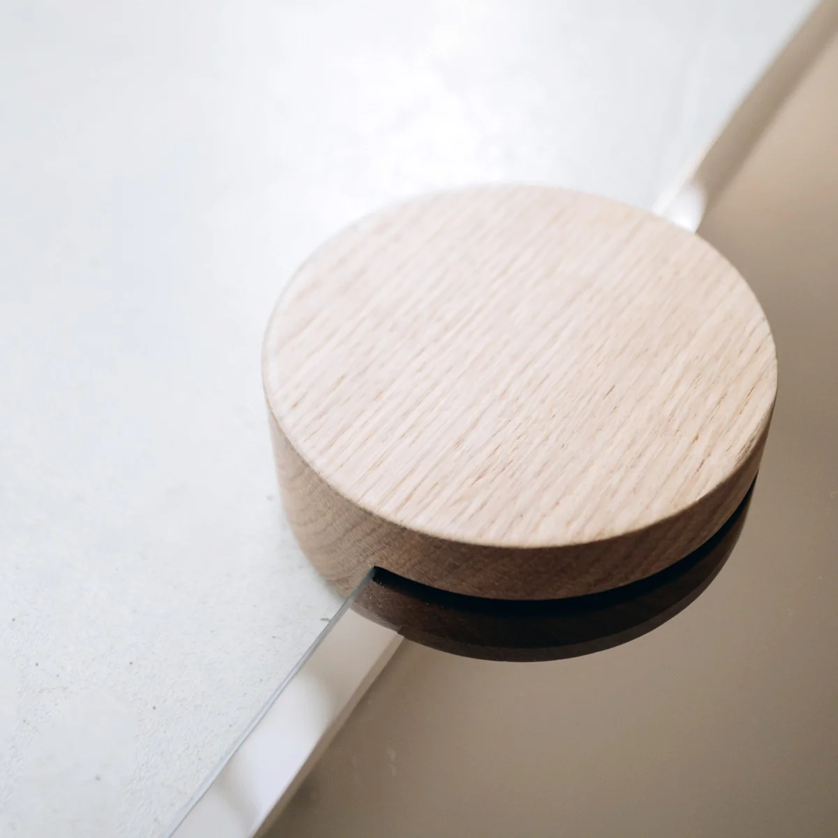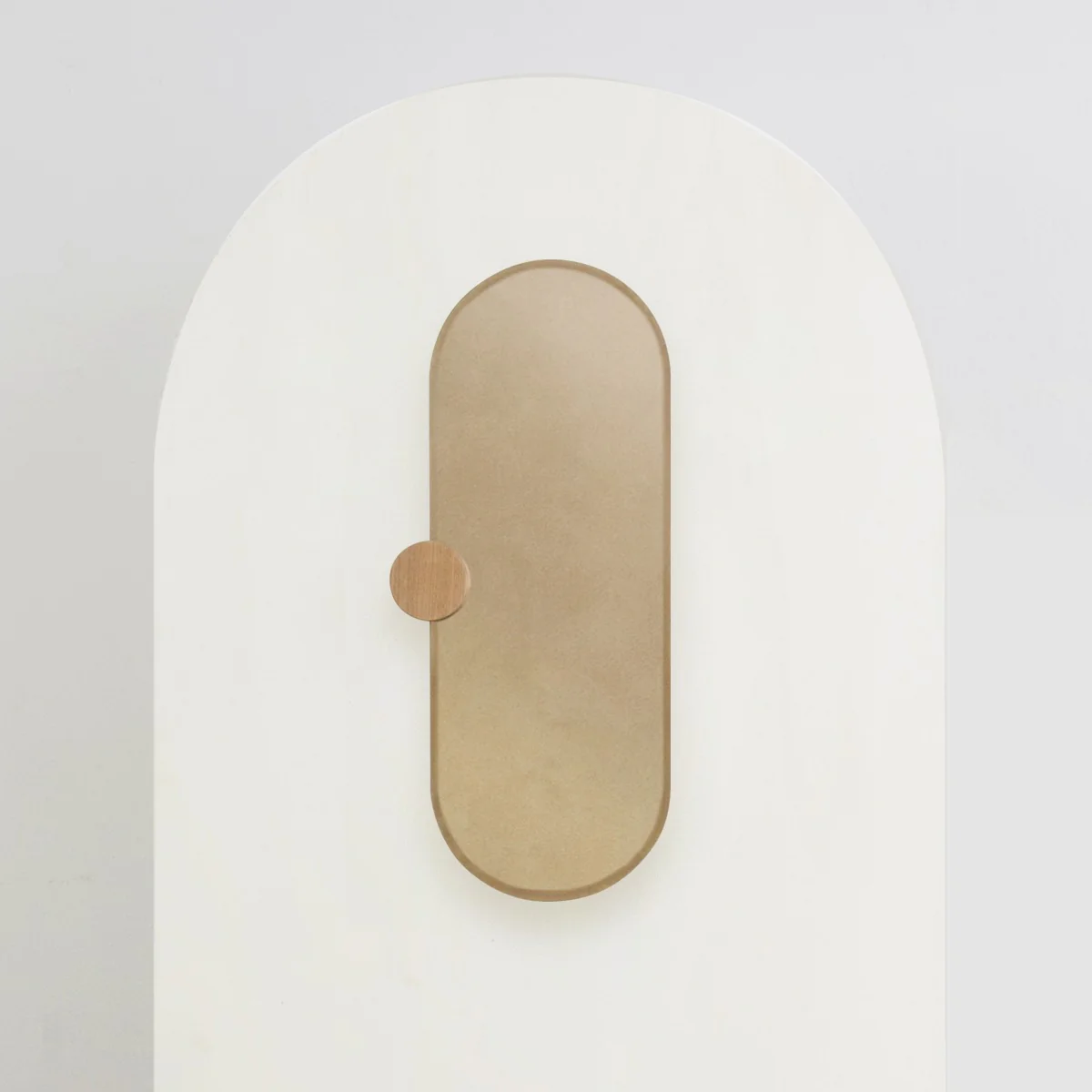 Très architectural avec son arche majestueuse, le miroir Sonia est aussi un jeu d’optique où la pièce de bois, comme un point de ponctuation, se reflète en cercles concentriques. Placé à l’horizontale où à la verticale, il est comme une ouverture sur le paysage du quotidien, une fenêtre sur le monde intime.