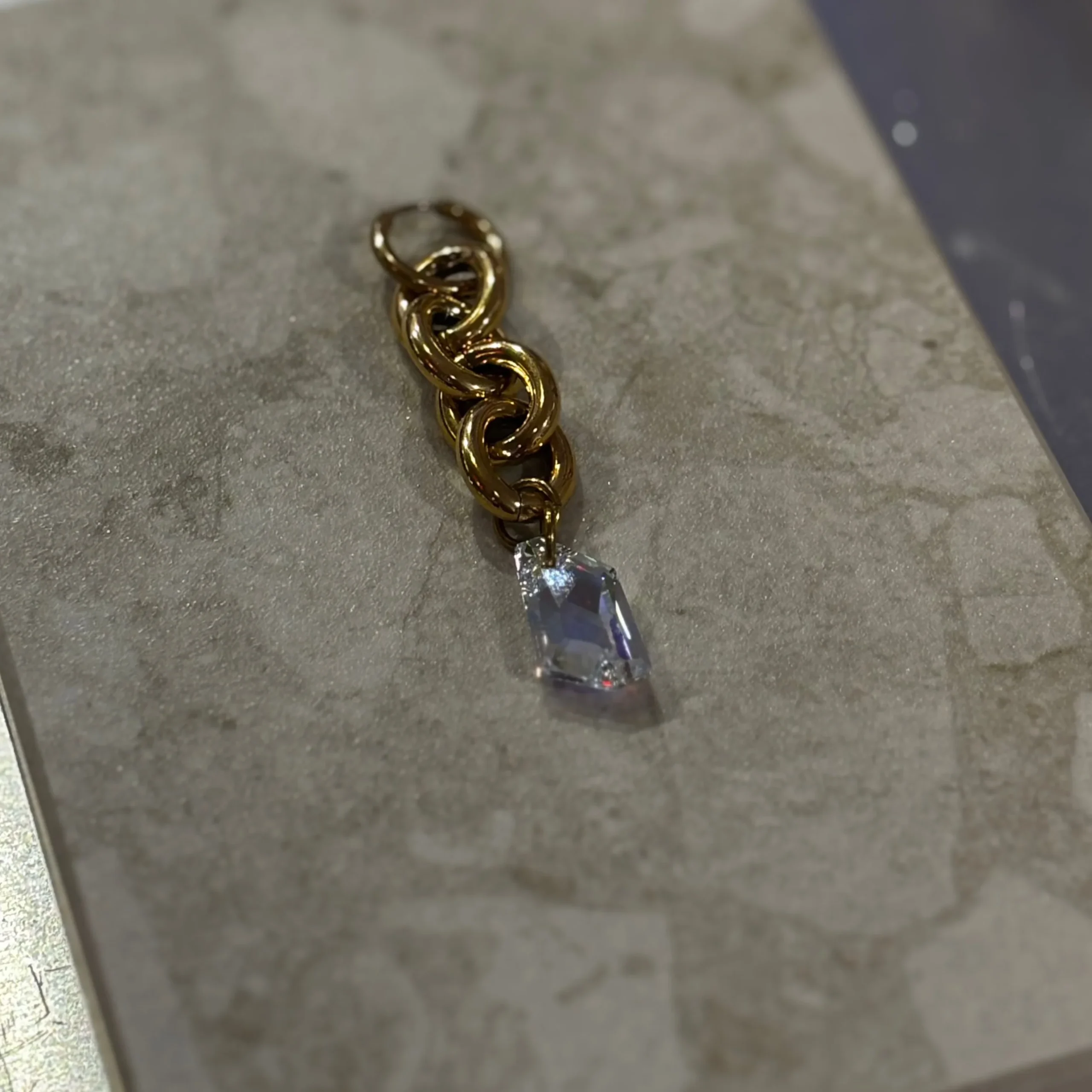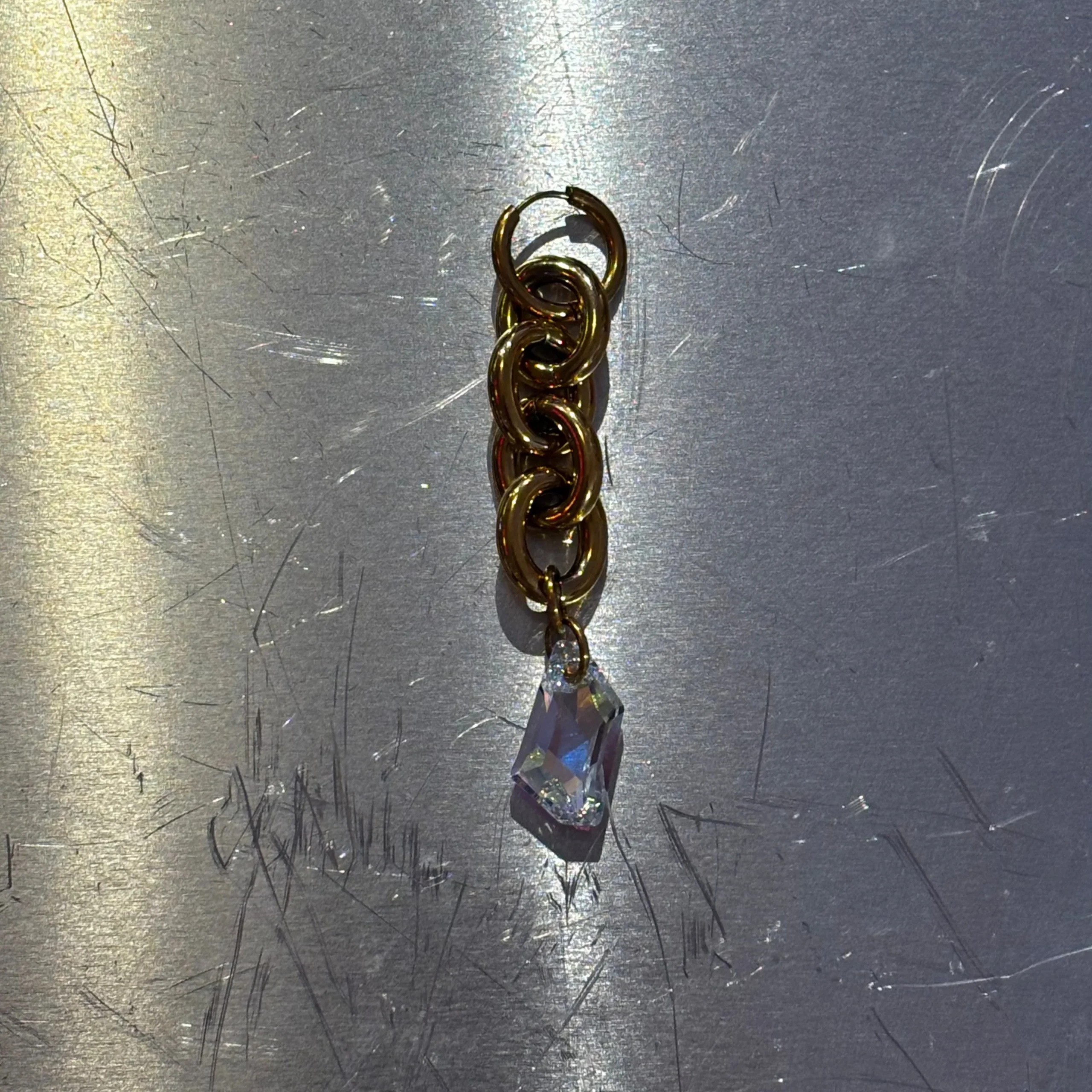Cette mono boucle incarne la simplicité chic, alliant harmonieusement l’or et le cristal.