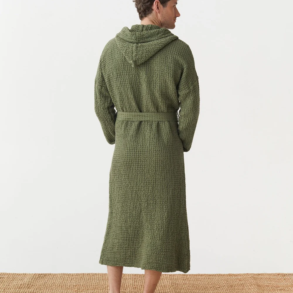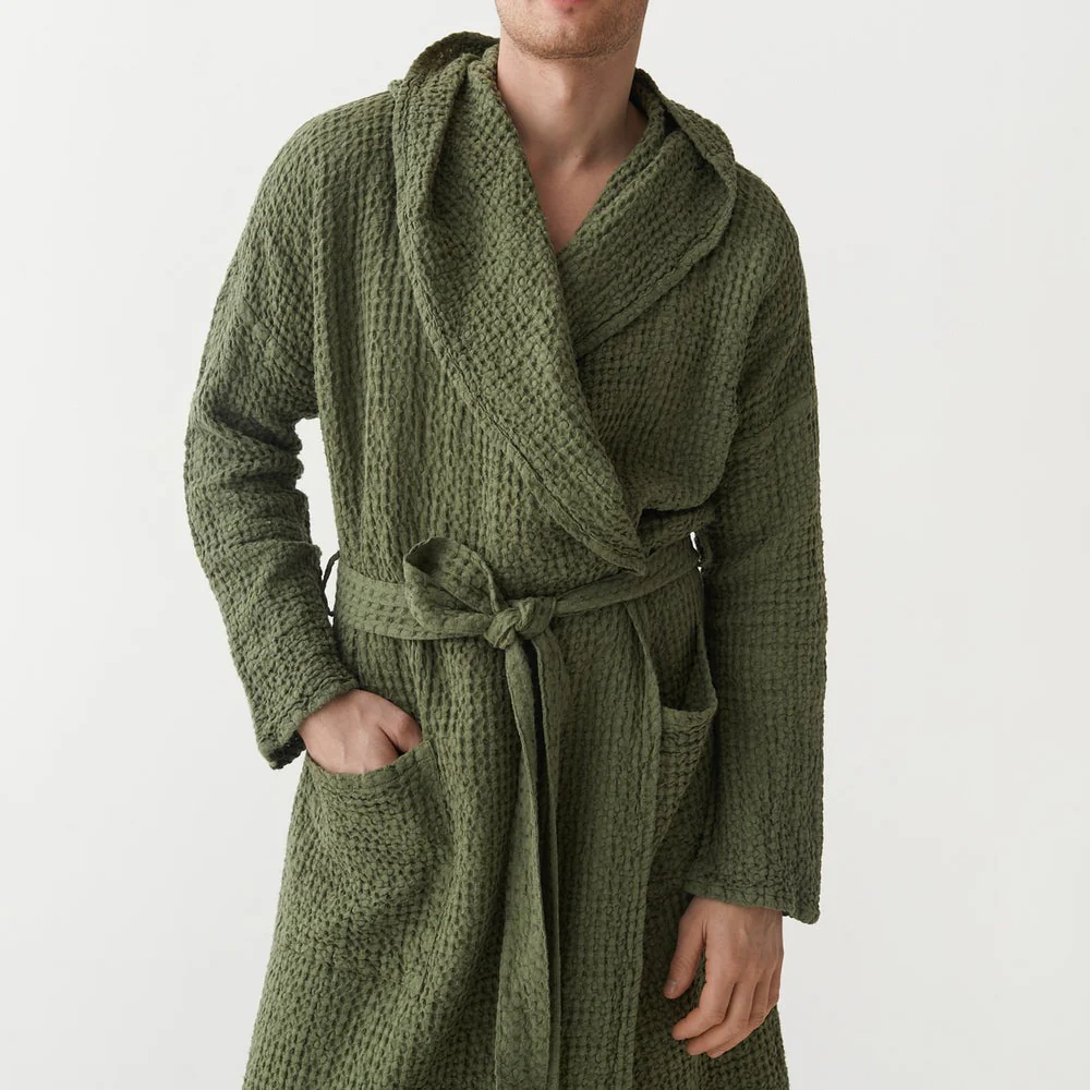 Ce peignoir en lin gaufré allie élégance et confort dans un style intemporel.