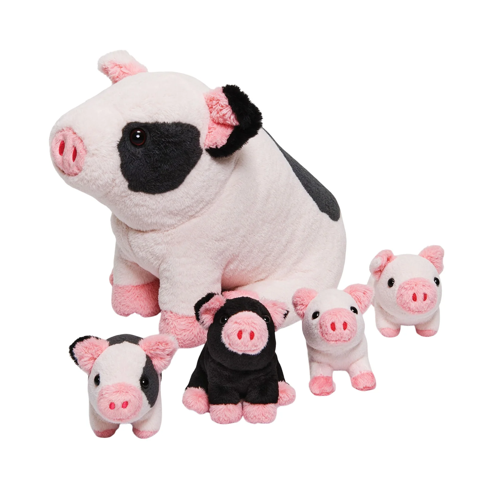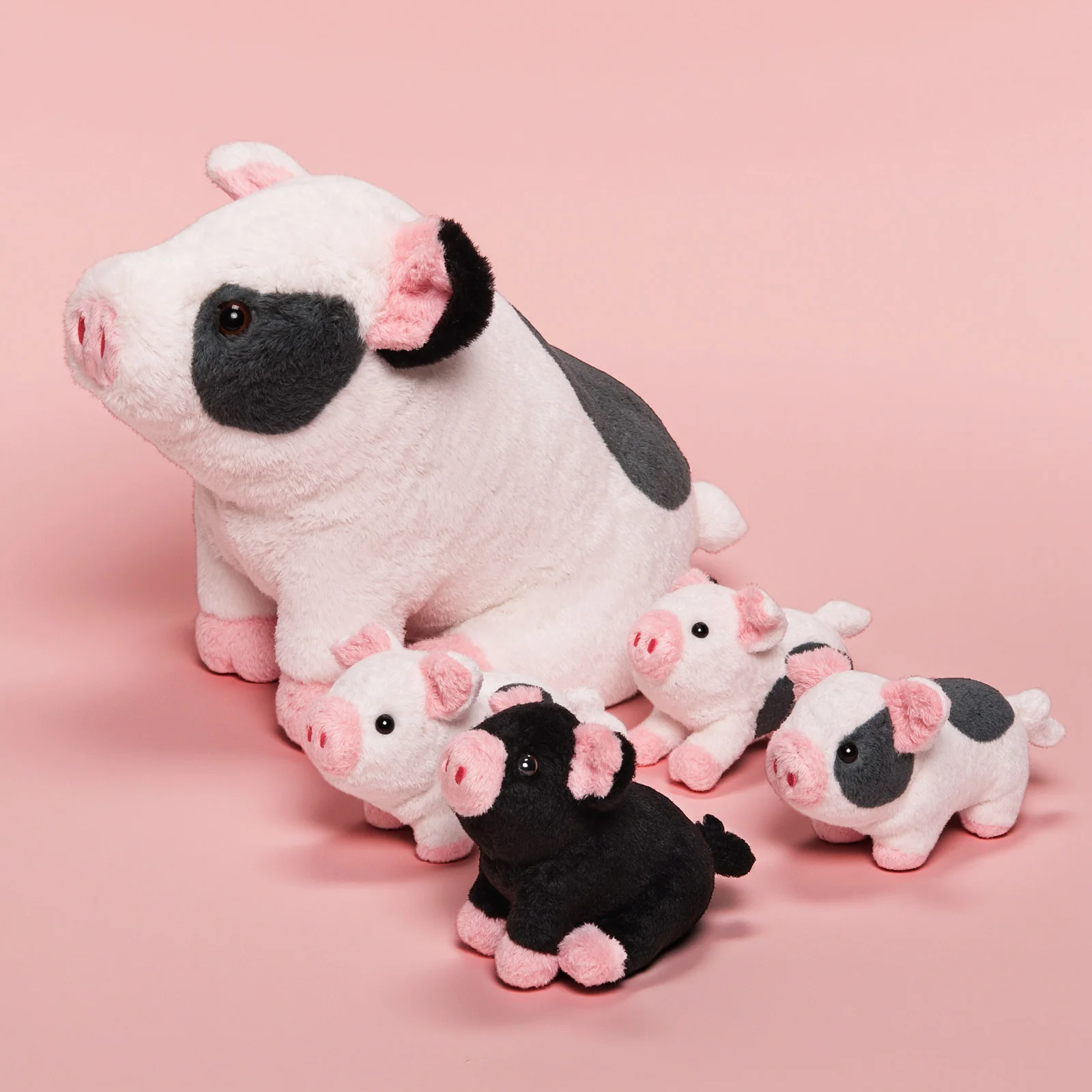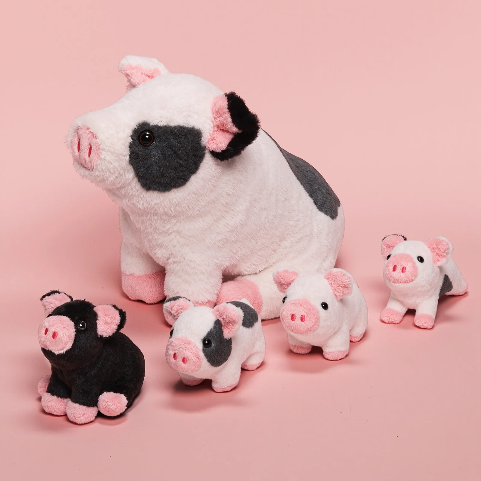 Cet ensemble de jouets en peluche comprend un cochon tacheté en peluche de 20 cm et quatre porcelets mignons de différentes couleurs, rose clair, noir, un cochon tacheté couché et un cochon tacheté debout, chacun. Les porcelets mignons ont tous des couleurs et des expressions différentes.