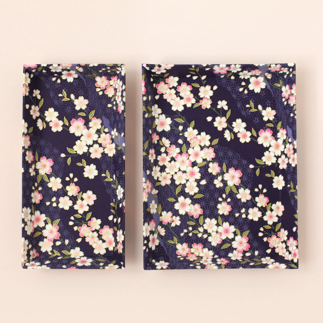 Jolis vide-poches recouverts de papier japonais aux motifs de fleurs de cerisier (sakura) et motifs variés dans les tons roses et violets foncés.